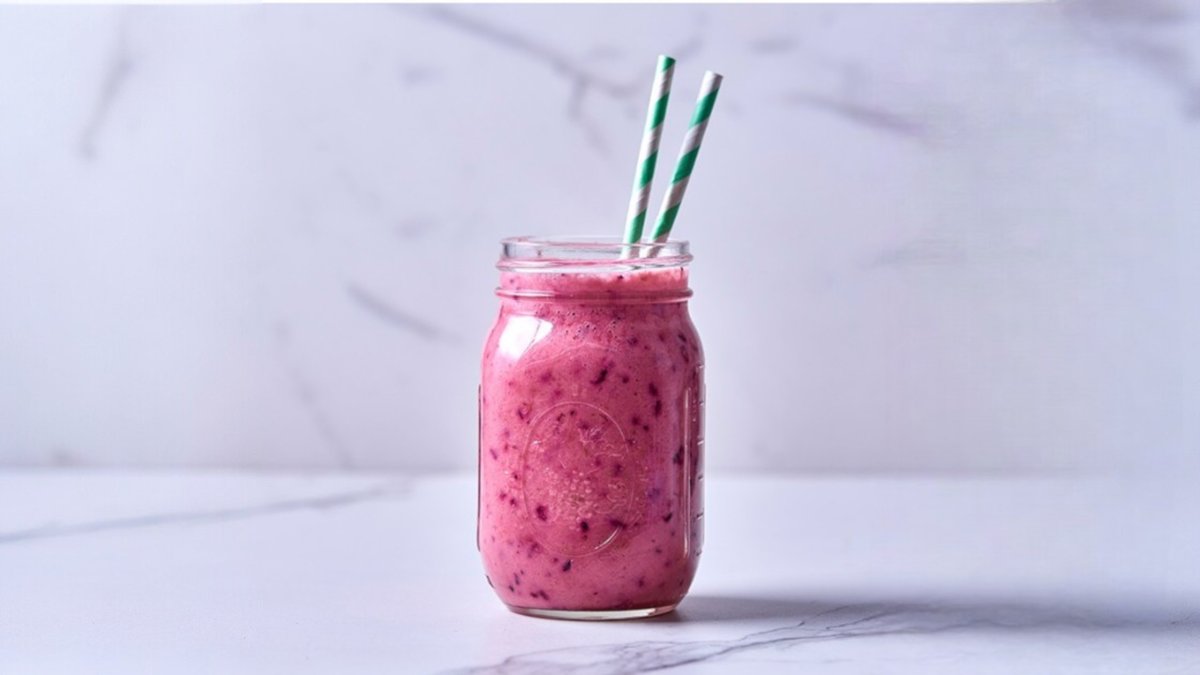 Mixed berries (strawberries, blueberries, raspberries), banana, greek yoghurt, honey, almond milk.