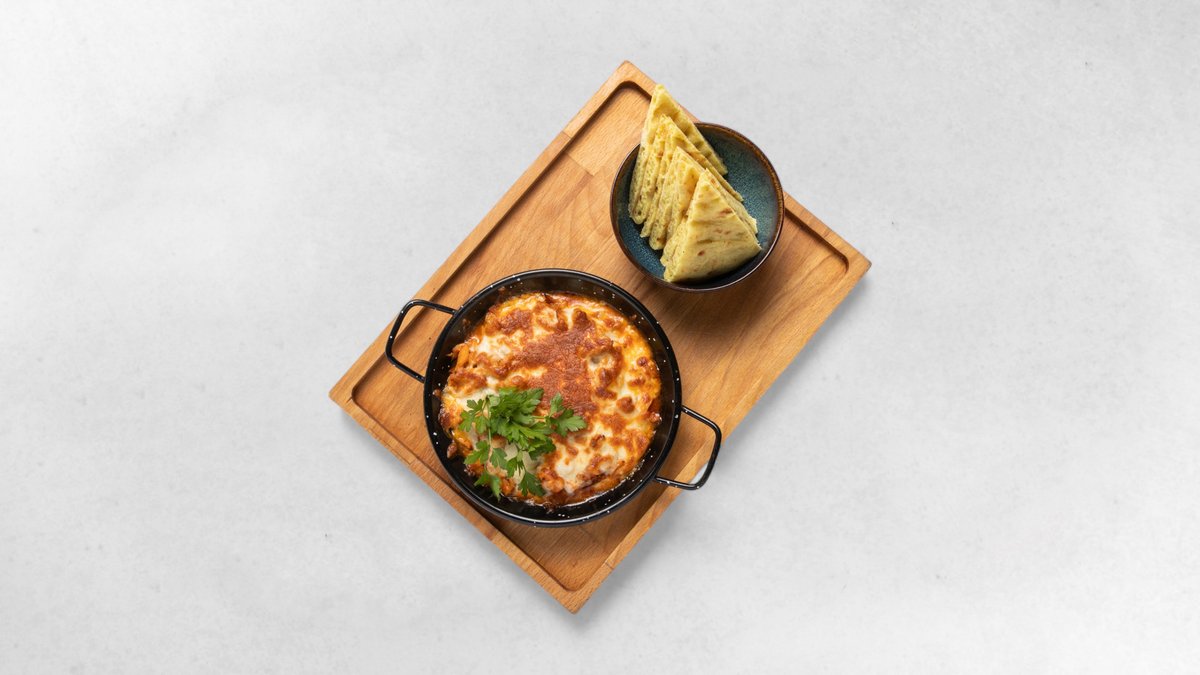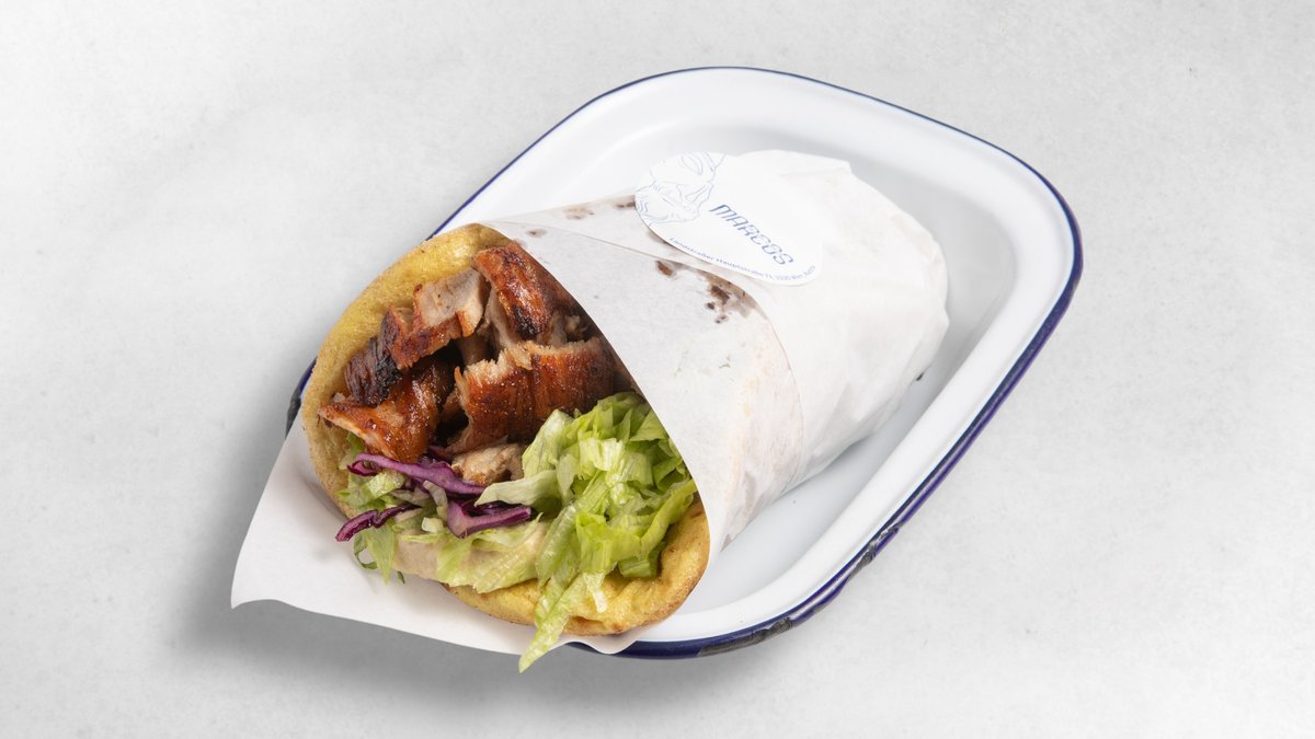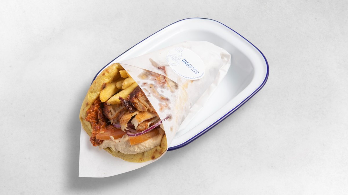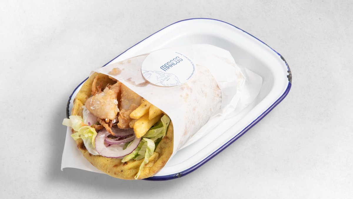 Handgemachtes Pita, Tzatziki, Patates, Zwiebeln, Tomaten