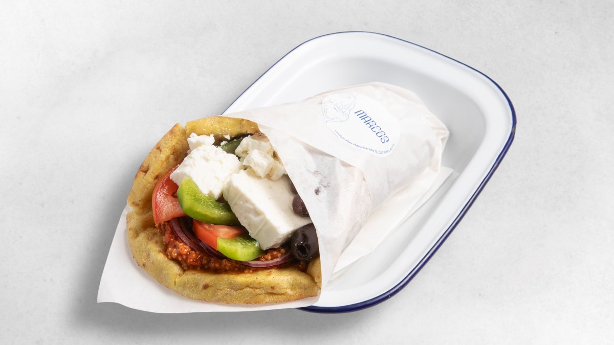 180g Greek Style Patty, Salat, Tomaten, Röstzwiebel, Feta, Honig-Senfsoße