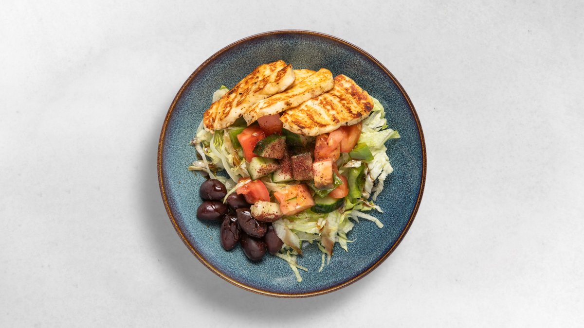 Gegrillter Halloumi, grüner Salat, Gurken, Tomaten, Oliven, Paprika, Marcos Granatapfel-Dressing