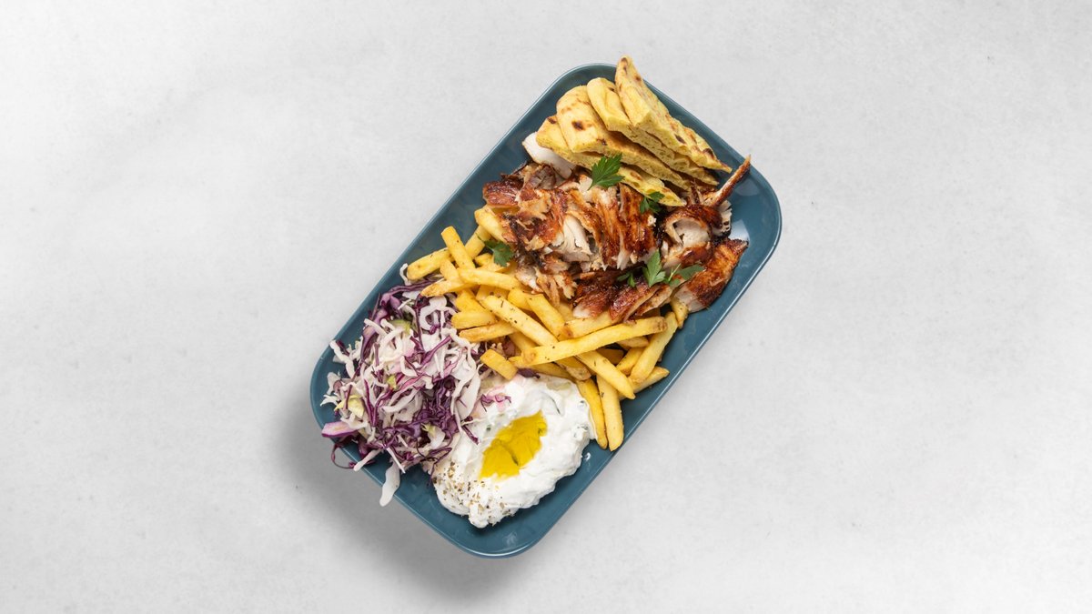 Hühnerfleisch, Salat Tomaten, Tzatziki, Patates