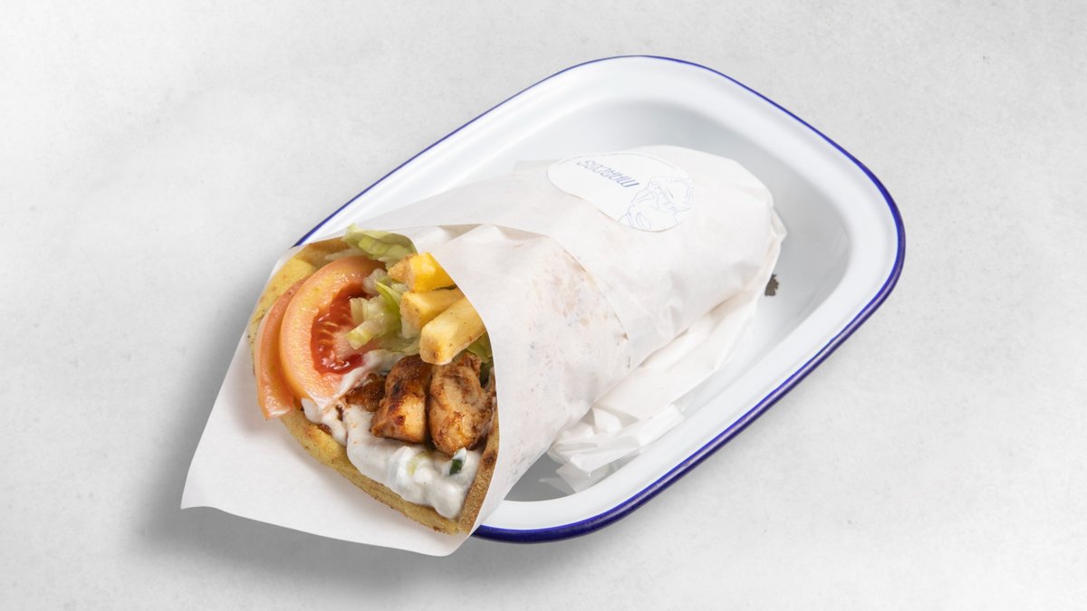 1 Spieß Hühner Souvlaki, 1 Spieß Schwein Souvlaki, Gyros, Tzatziki, Grünzeug, Pita, Patates