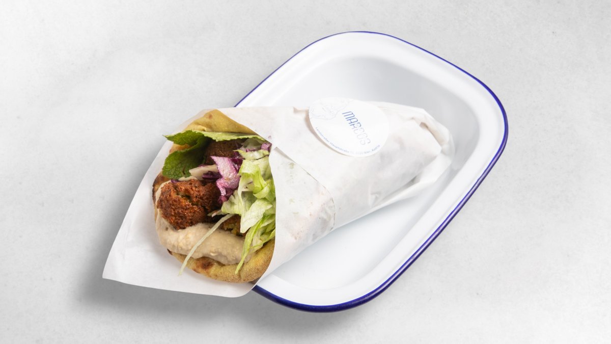 Vegan Falafel Patty, Tomaten, Salat, Hummus, Essiggurke