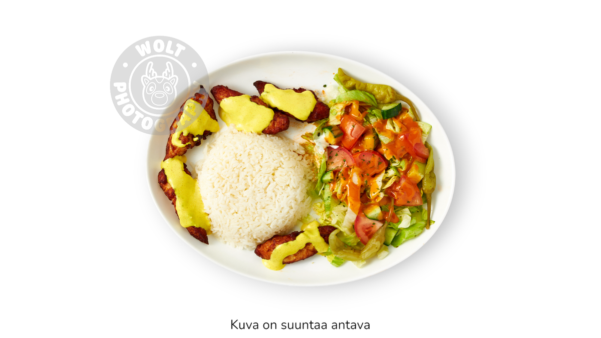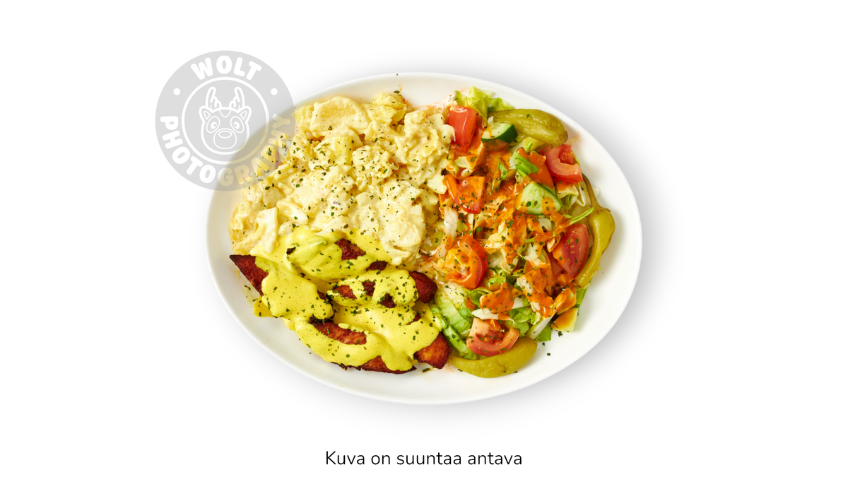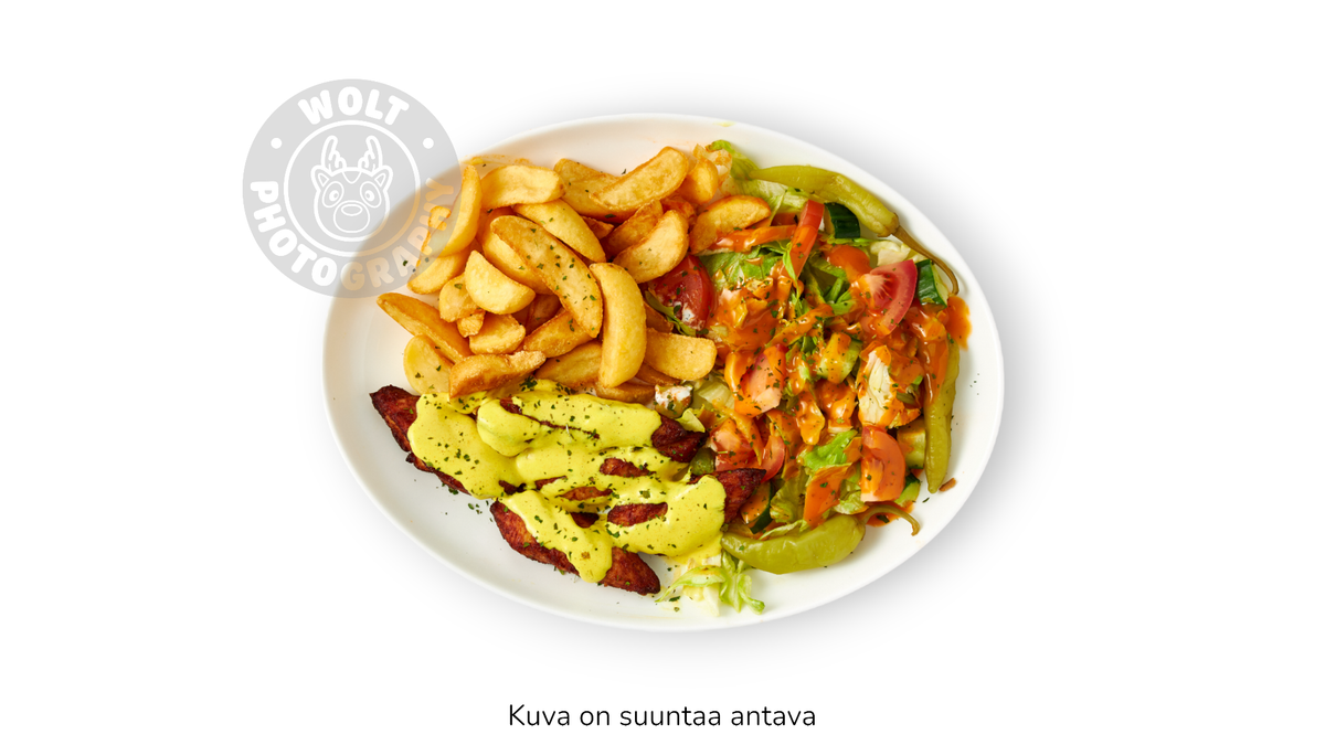 Kaikkiin annoksiin kuuluu jäävuorisalaatti, tomaatti, kurkku, sipuli, turkinpippuri, salaattikastike ja chili-, mieto- tai valkosipulikastike.