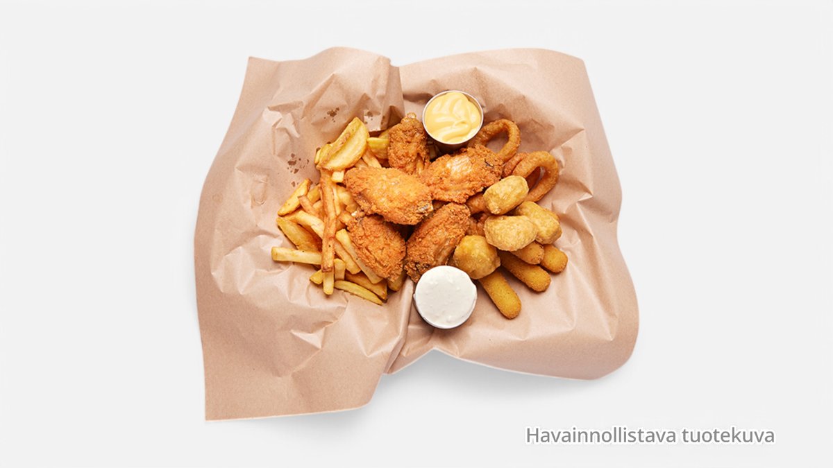 6 kpl hot wings 6 kpl nugetit 4 kpl mozzarellatikut 4 kpl sipulirenkaat Ranskalaiset ja 2 kpl dippiä