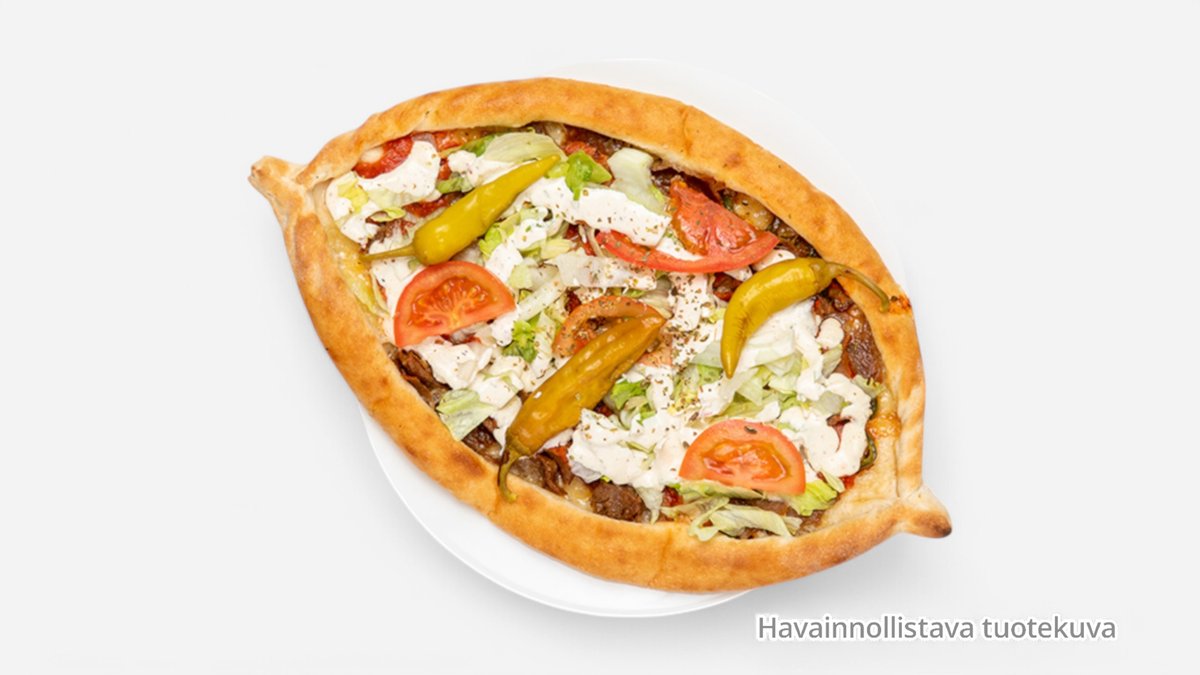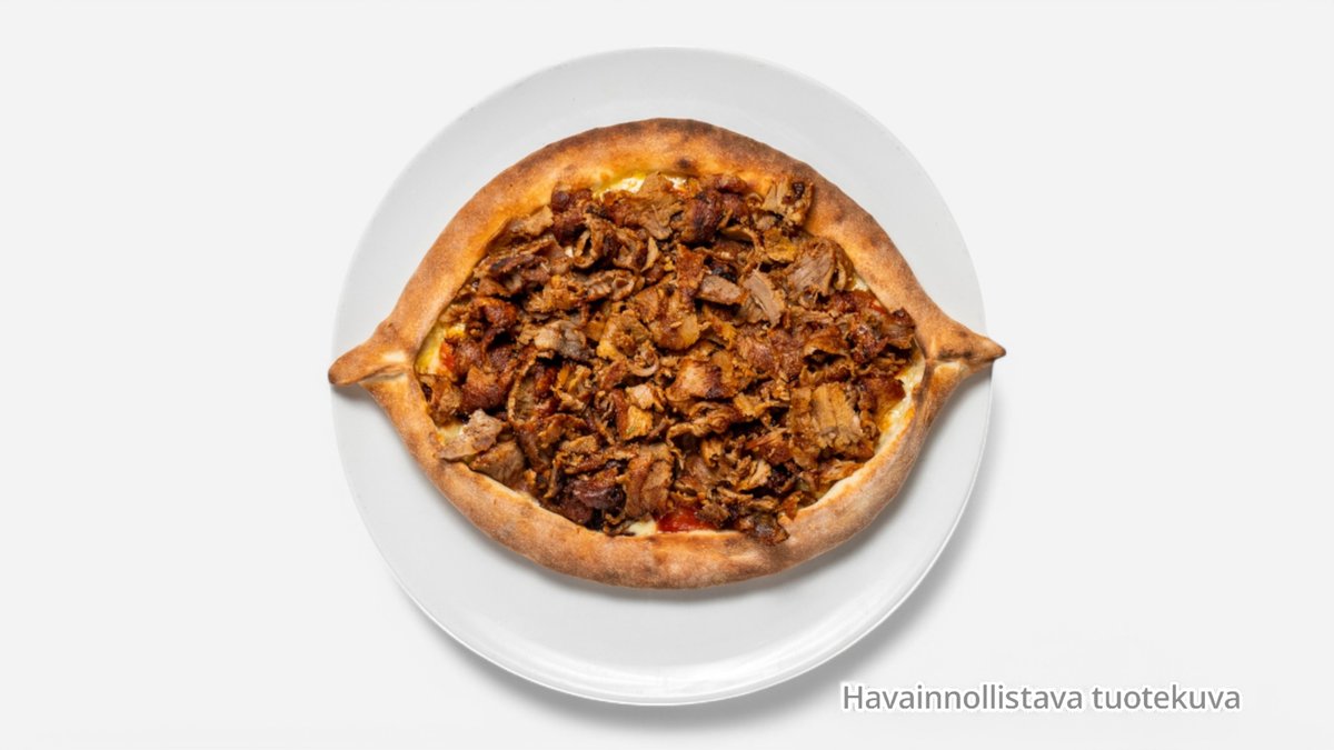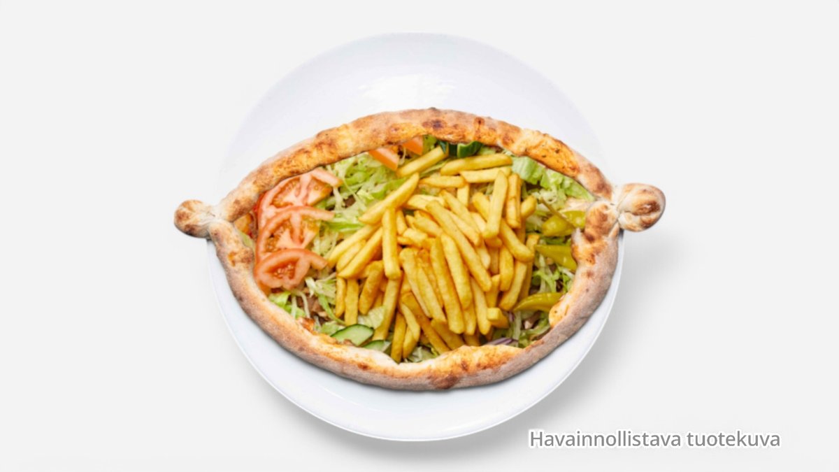Venepizza, sisällä kebab, salaatti, ranskalaiset ja talon kastike