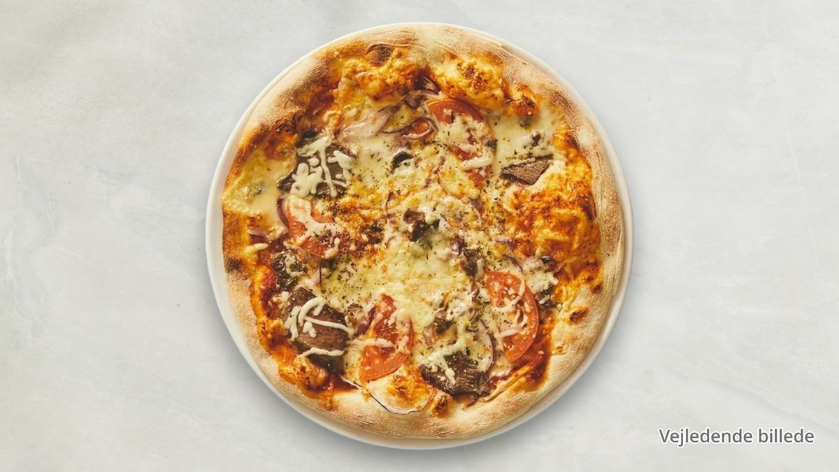 Tomat, ost, løg, champignon og oksekød. Serveres med en valgfri sodavand.