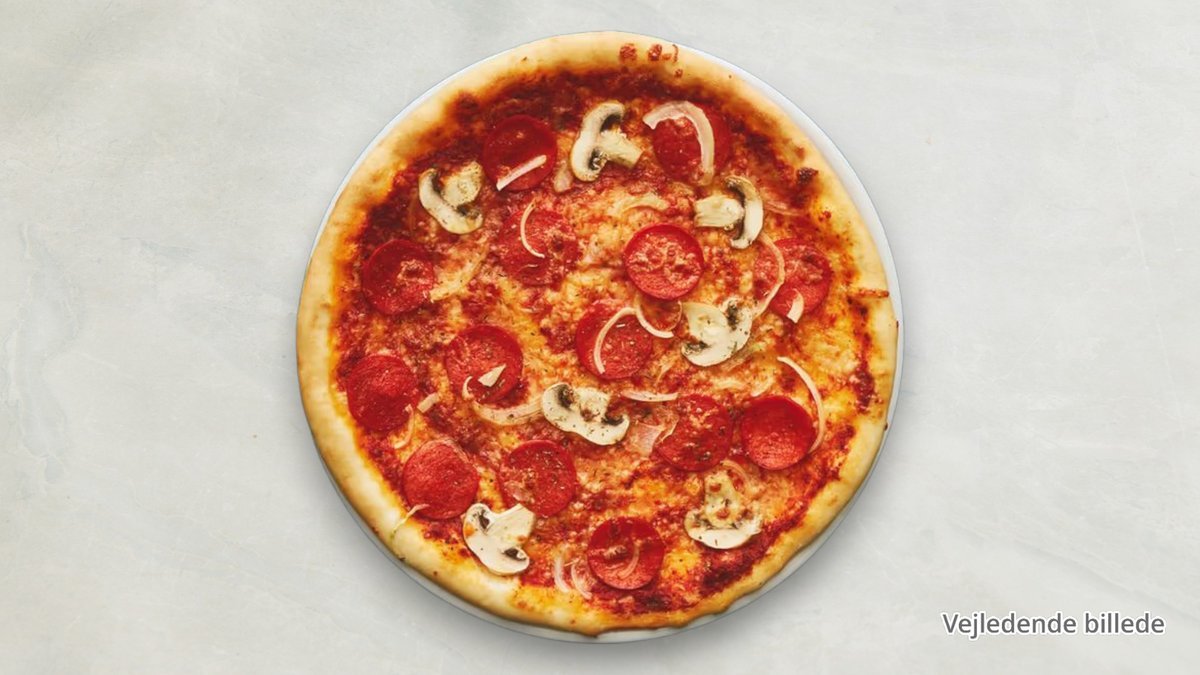 Pizza med tomatsauce, ost, løg, pepperoni og champignon.