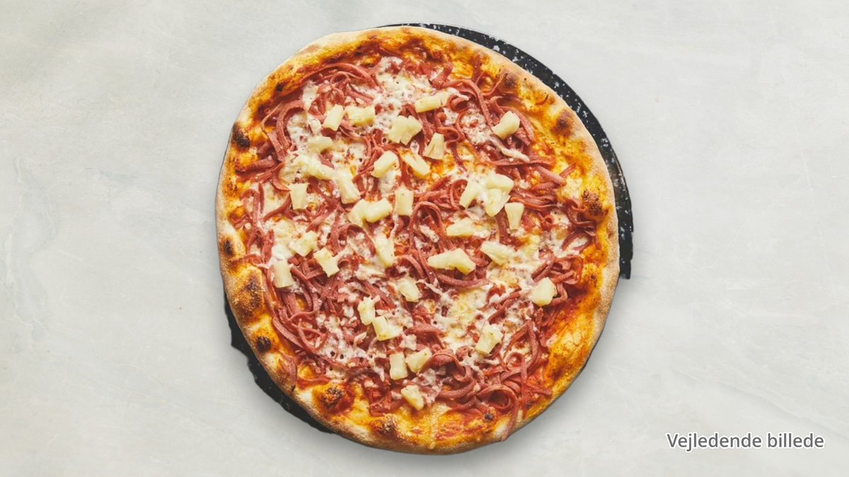 Pizza med tomatsauce, ost, ananas og kalkunskinke. Serveres med en pommes frites og valgfri sodavand.