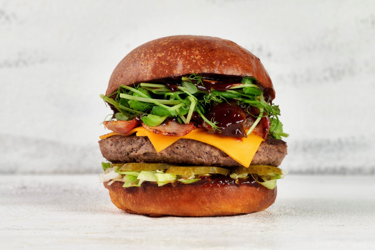 100% Angus Jautienos maltinukas (kepimo lygis well done), BBQ padažas, karamelizuoti svogūnai, marinuoti agurkėliai, daigai, kepta šoninė, čederio sūris, iceberg salotos
