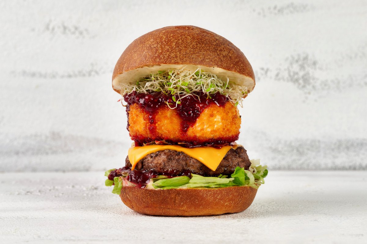 100% Jautienos maltinukas (medium kepimo lygis), alabama baltas BBQ majonezas, iceberg salotos, čederio sūris, panko džiūvesėliuose paniruotas ir gruzdintas camembert sūris, bruknių pagardas, daigai