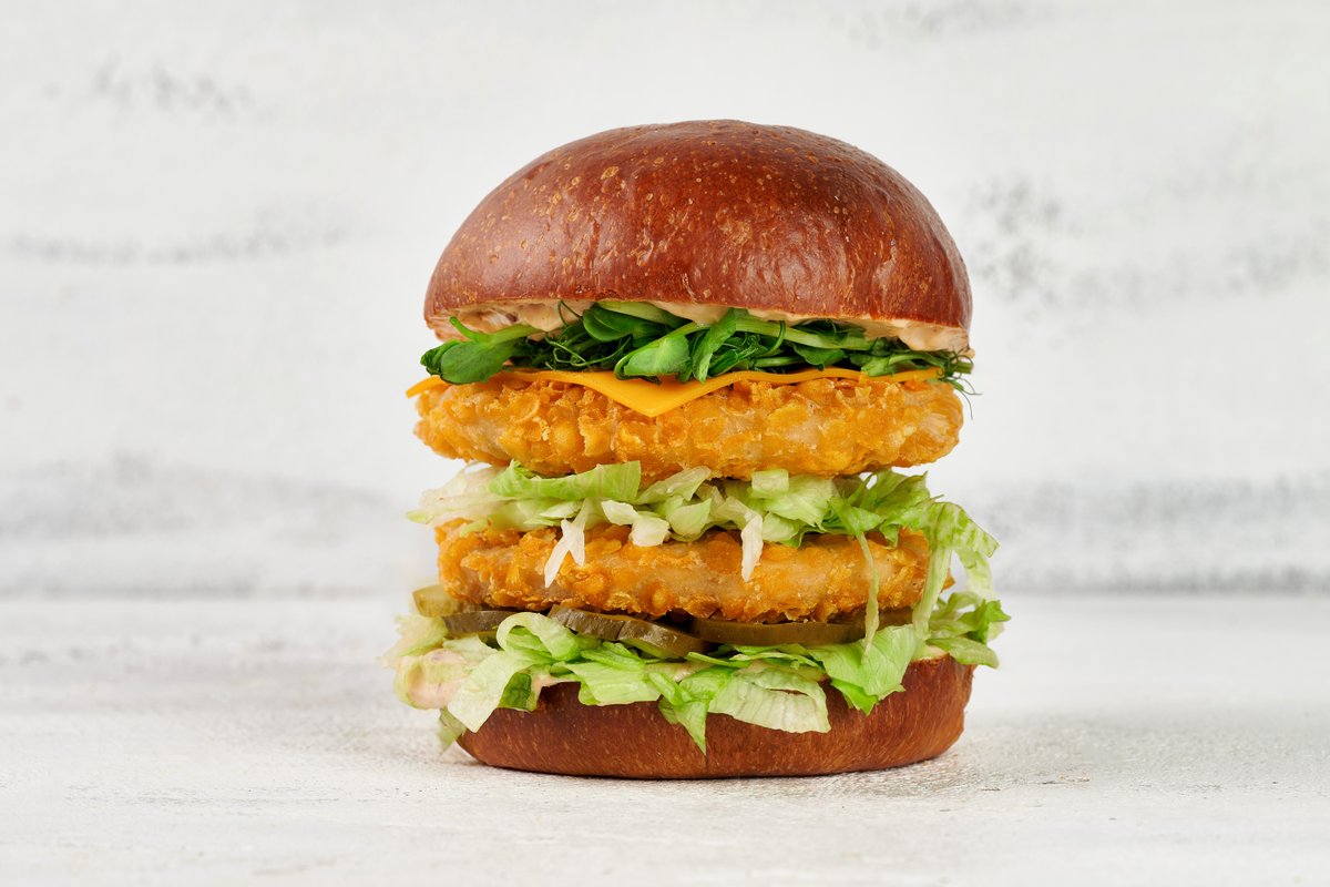 Panko džiūvesėliuose paniruotas ir gruzdintas camembert sūris, alabama baltas BBQ majonezas, iceberg salotos, bruknių džemas, liucernos daigai