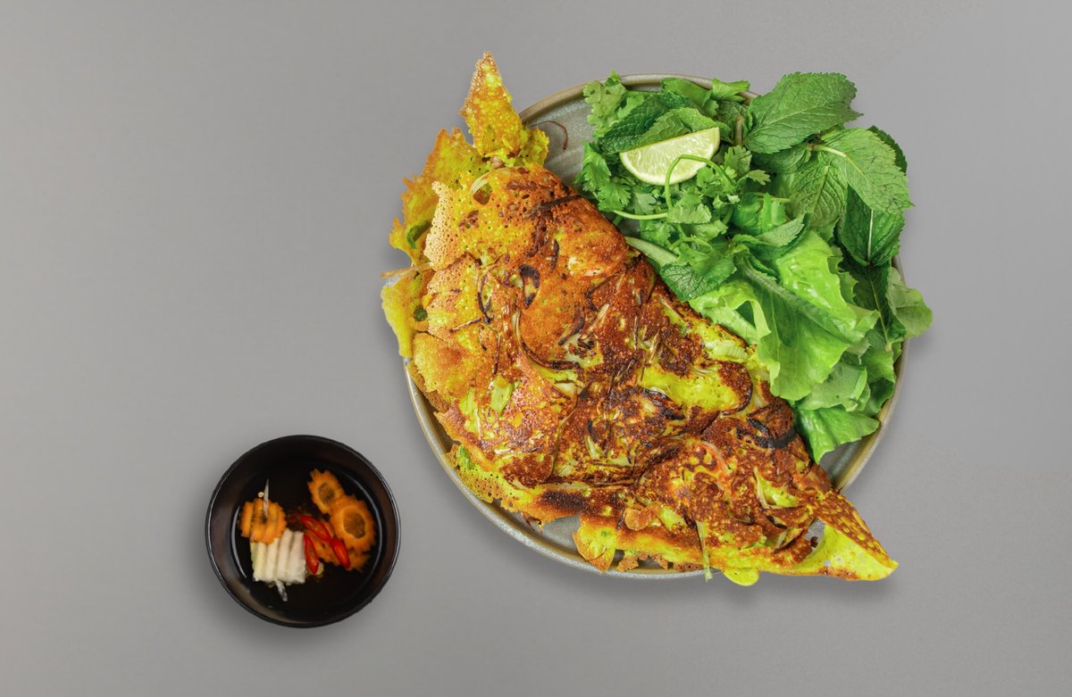 A crispy crepe filled with pan-fried pork belly, king prawns, and mung bean sprouts. Eat by hand: Wrap a piece of crepe with herbs in a lettuce leaf and dip it into Nước Chấm sauce.