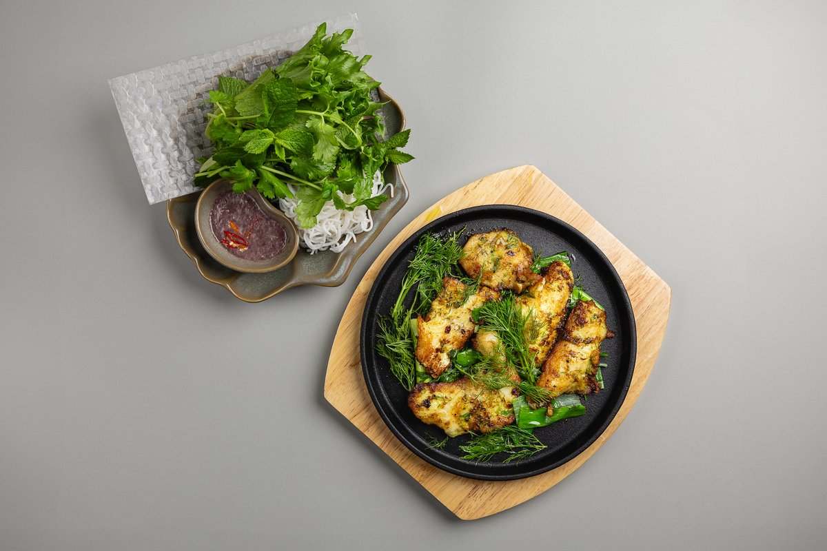Pan-fried pike-perch on a bed of dill, served with rice vermicelli, lettuce, and herbs. Eat by hand: Wrap a piece of fish, vermicelli, and herbs in rice paper or lettuce and dip it into the sauce.