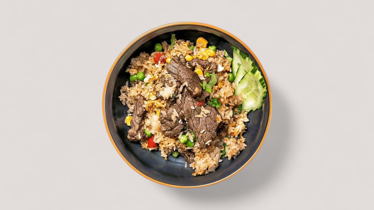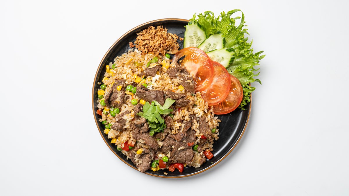 Your choice of protein stir-fried with rice and vegetables, topped with roasted onions.