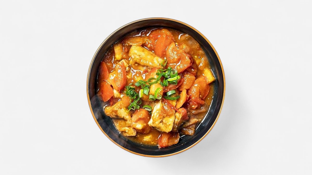 Nonla's homemade tofu in a fresh tomato sauce, served with rice.