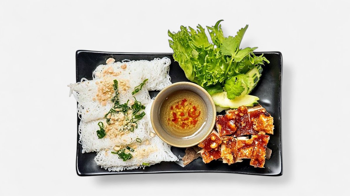 Roasted crispy pork belly with woven rice vermicelli, fresh vegetables, herbs, and Nước Chấm sauce.