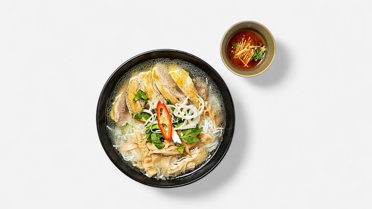 Braised duck breast, rice vermicelli, bamboo shoots, and herbs in a flavorful broth. Served with a side salad and Nonla's ginger dip.