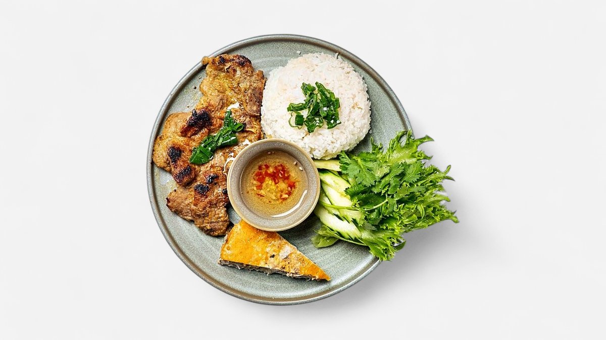 Grilled pork chop, steamed egg, rice, and vegetables, served with Nước Chấm sauce.