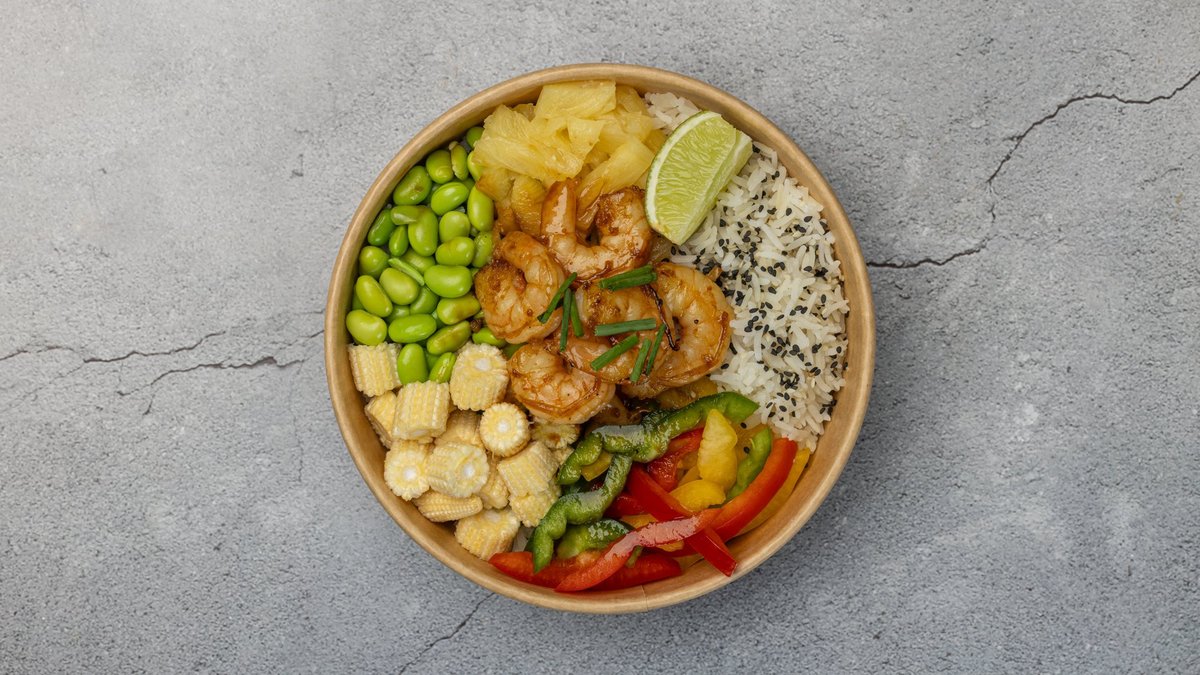 Sammensæt din egen bowl på en bund af teriyaki-stegte ris. Vælg ét protein, tre slags tilbehør og én topping — afrundet med cremet chili-mayo dressing.