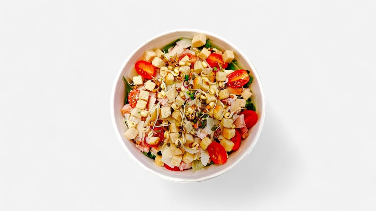 Värske salatipõhi, röstitud kana, Pasta Heaveni kaste, krutoonid, parmesanilaastud