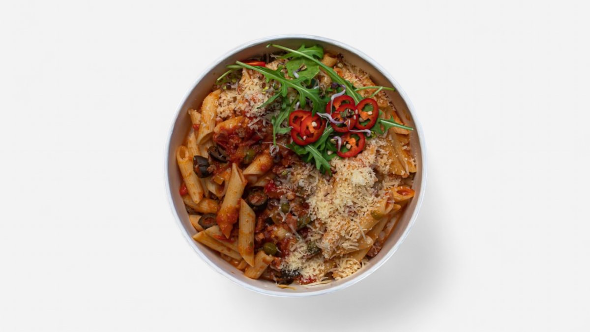penned, purustatud tomatid, suitsupõseliha, kapparid, oliivid, tšilli, parmesan, ürdid