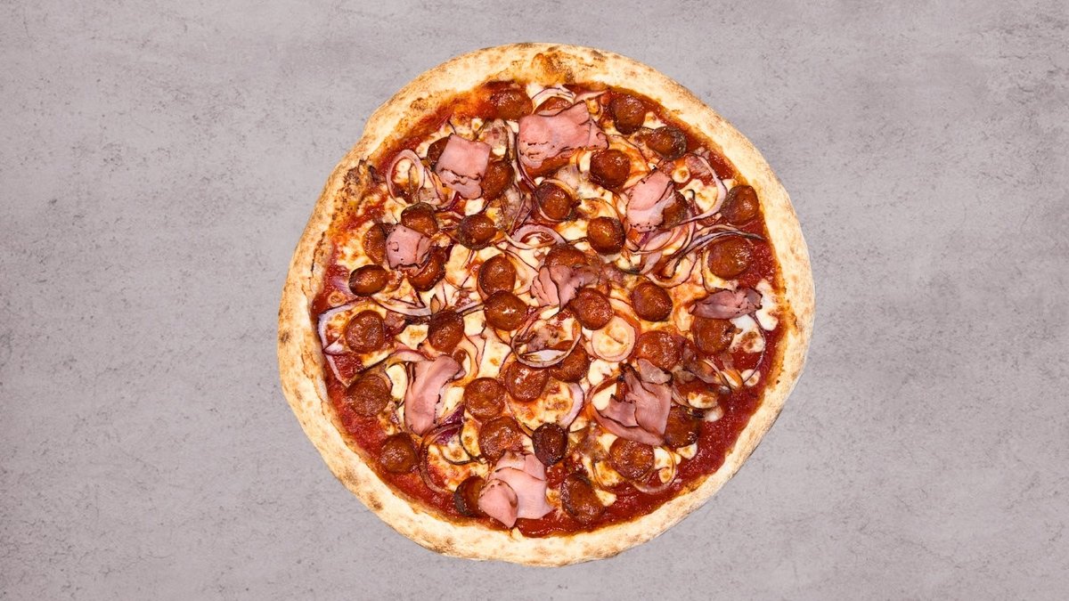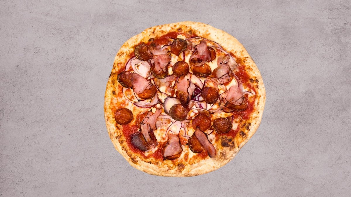 paradicsomszósz, mozzarella sajt, gyulai kolbász, bacon, sonka, lilahagyma