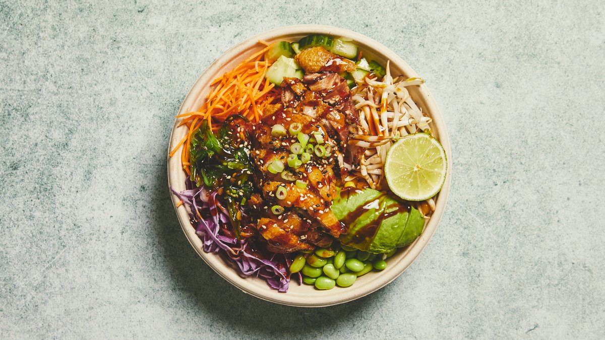 Crispy duck med valgfri base, avocado, mix salat, tang, majs, gulerød, edamamebønner, agurk, rødkål, sesamfrø, goma sauce, chillimayo og teriyaki.