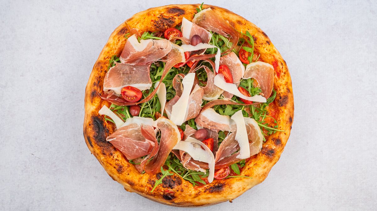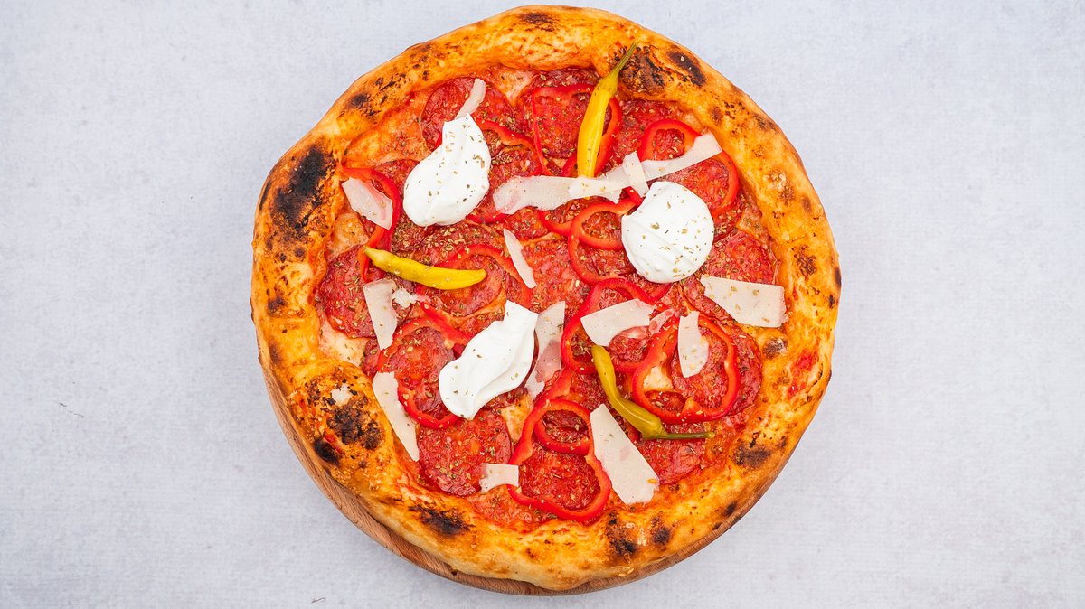 Krema, kackavalj, pršuta, kulen, crveni luk, parmezan, ceri, masline, origano