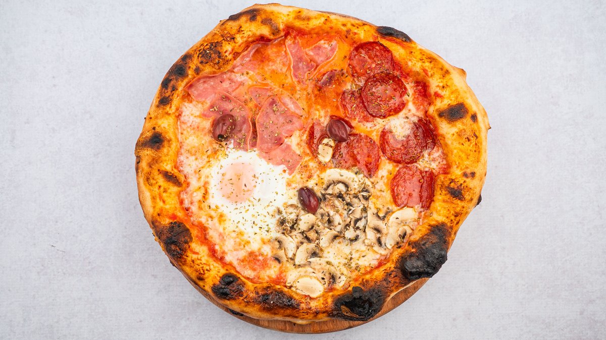 Pelat, kackavalj, kulen, šunka, pečurke, jaje, parmezan, masline, origano
