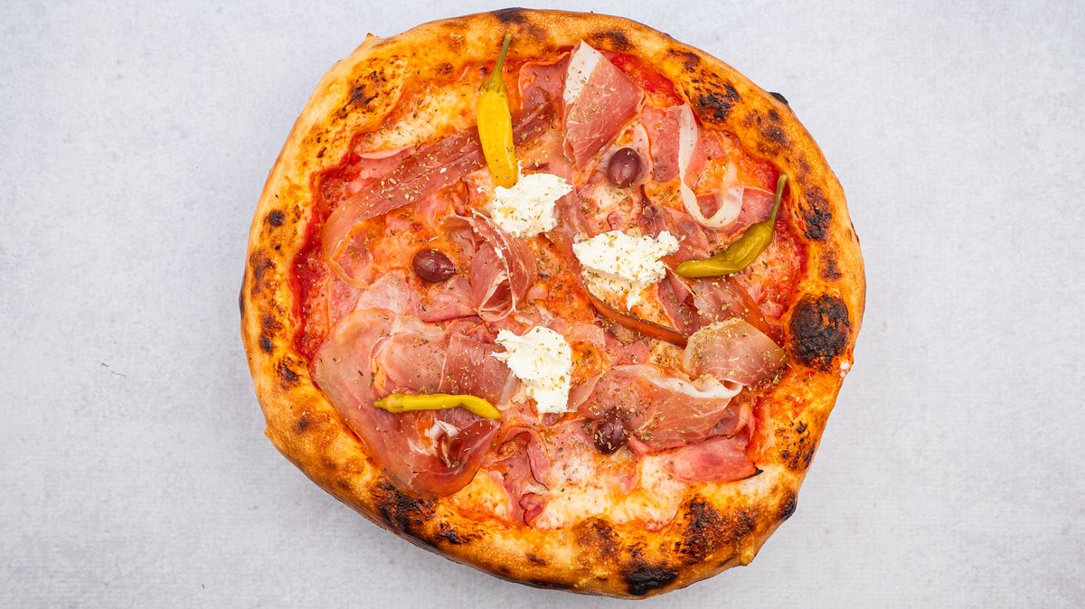 Pelat, kackavalj, šunka, slanina, pršuta, kajmak, feferone, origano, masline