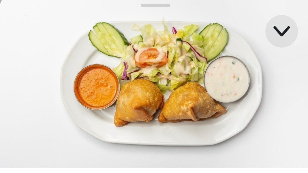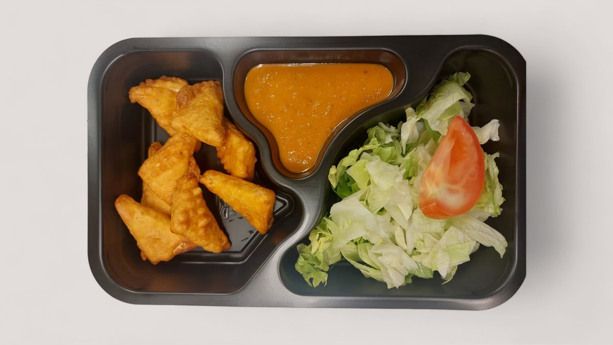 Perunalla ja herneillä täytetty friteerattu kasvispasteija.