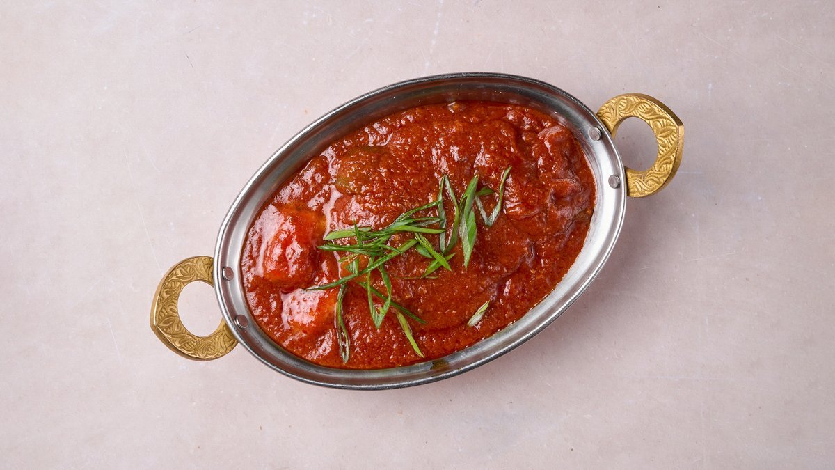 Marinoitua kanaa, lampaan ulkofilepaloja, friteerattuja jättikatkarapuja, tuorejuustoa, paprikaa ja sipulia tarjoiltuna kermaisessa ja tulisessa masalakastikkeessa.