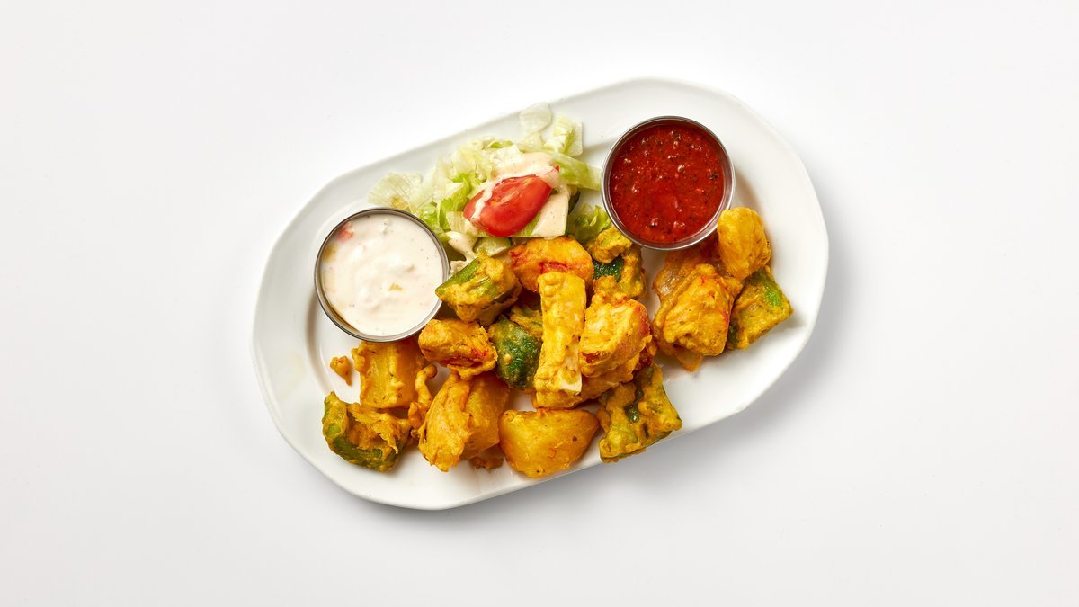 Friteerattua kanaa, katkarapuja, kasviksia ja tuorejuustoa