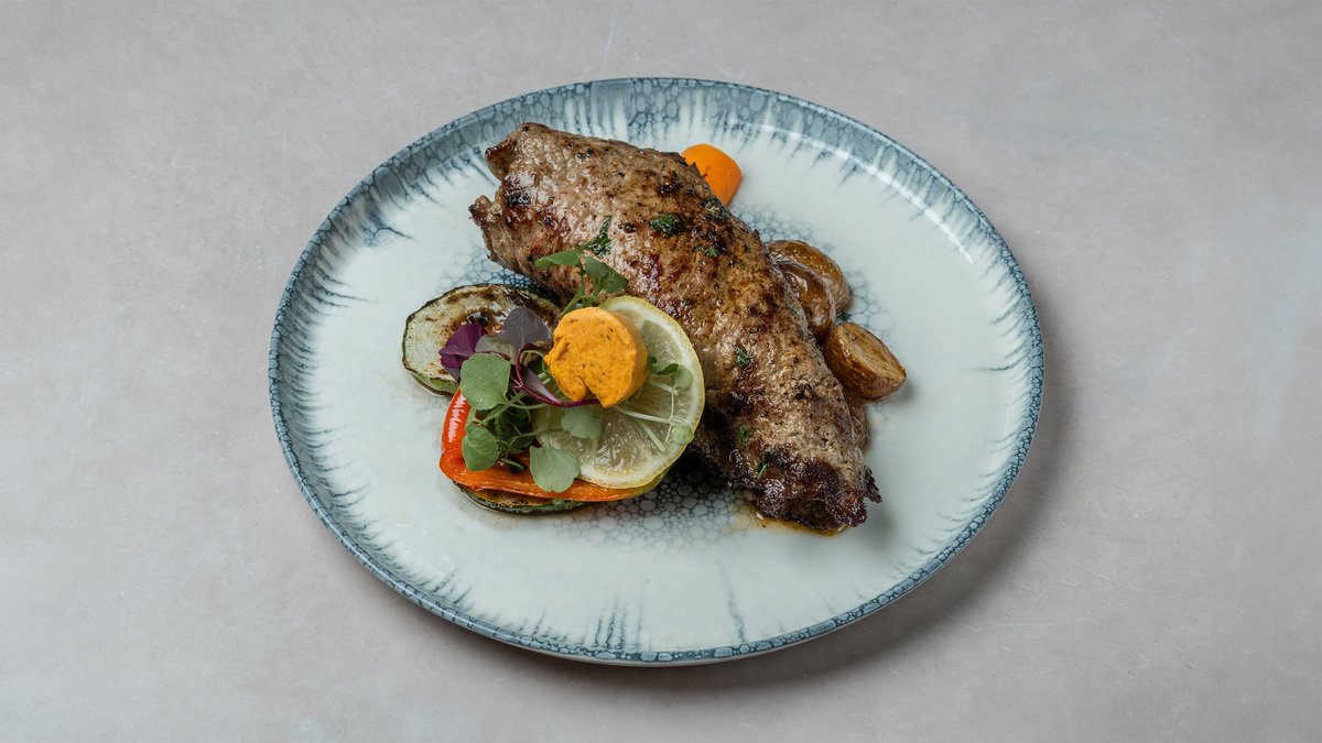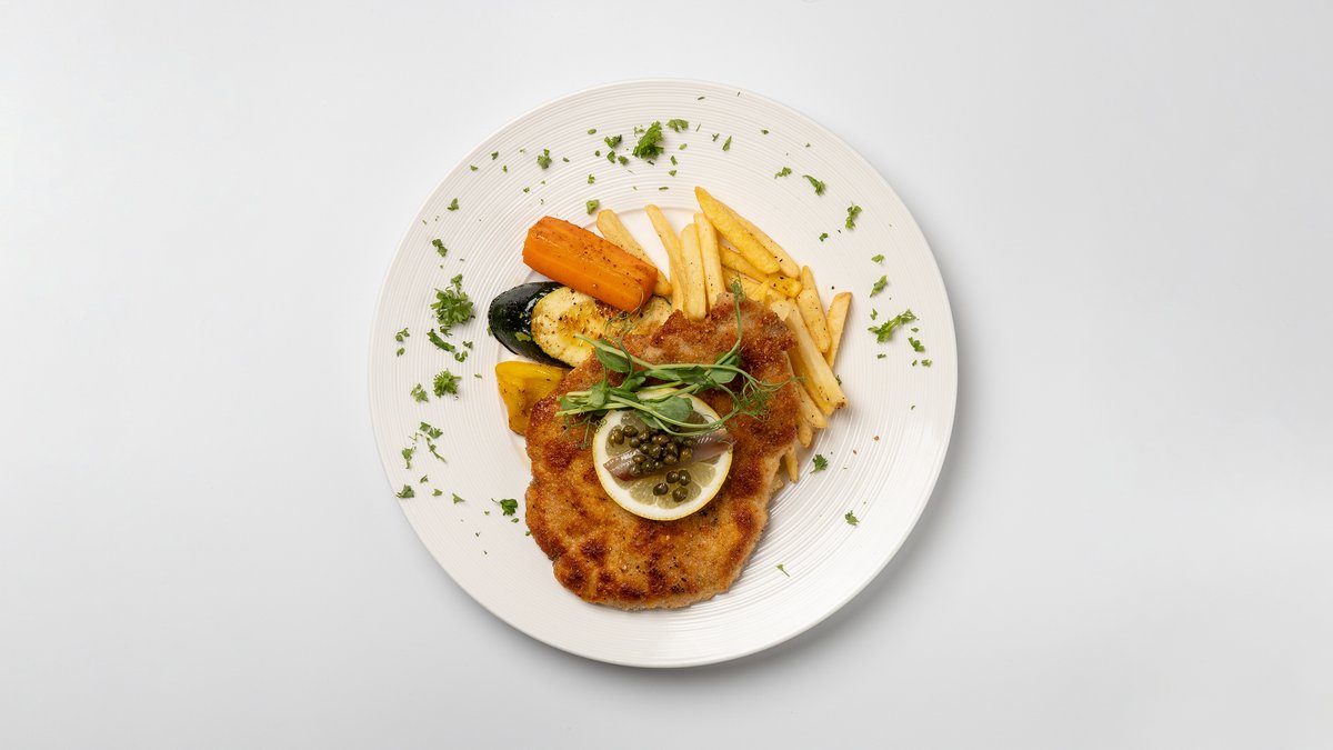 LEIVITETTYÄ PORSAAN ULKOFILEETÄ (200 G), TUOREITA KASVIKSIA JA RANSKANPERUNOITA. TARJOILLAAN SITRUUNAN, KAPRISTEN JA ANJOVIKSEN KERA