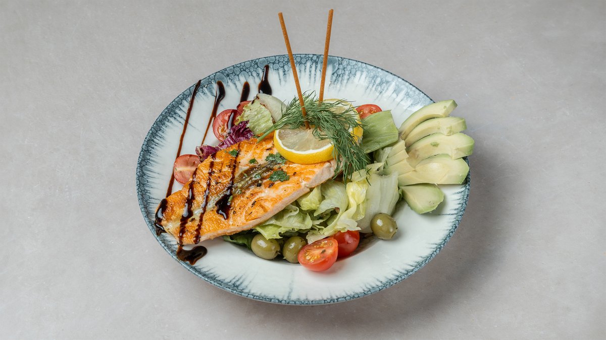 GRILLATTUA LOHIFILEETÄ, SALAATTIA, OLIIVEJA, KIRSIKKATOMAATTIA, GRANAATTIOMENAA JA BALSAMICOA