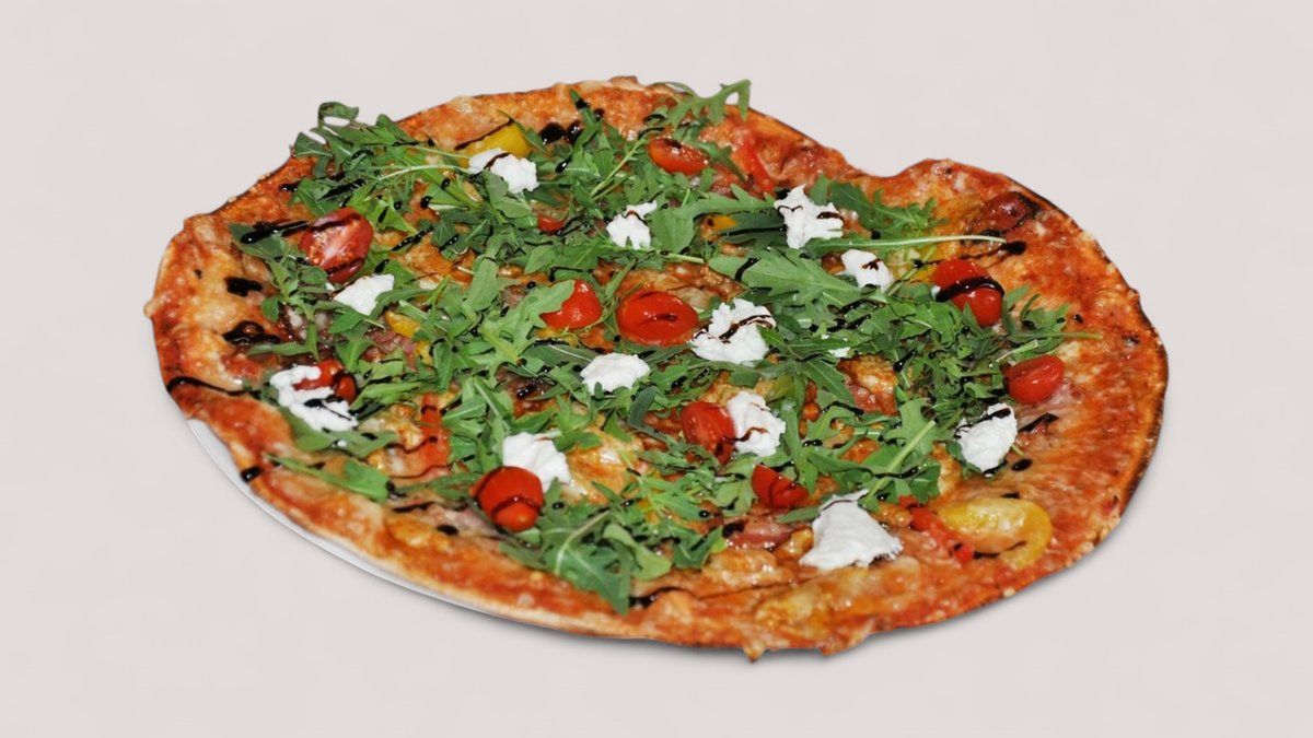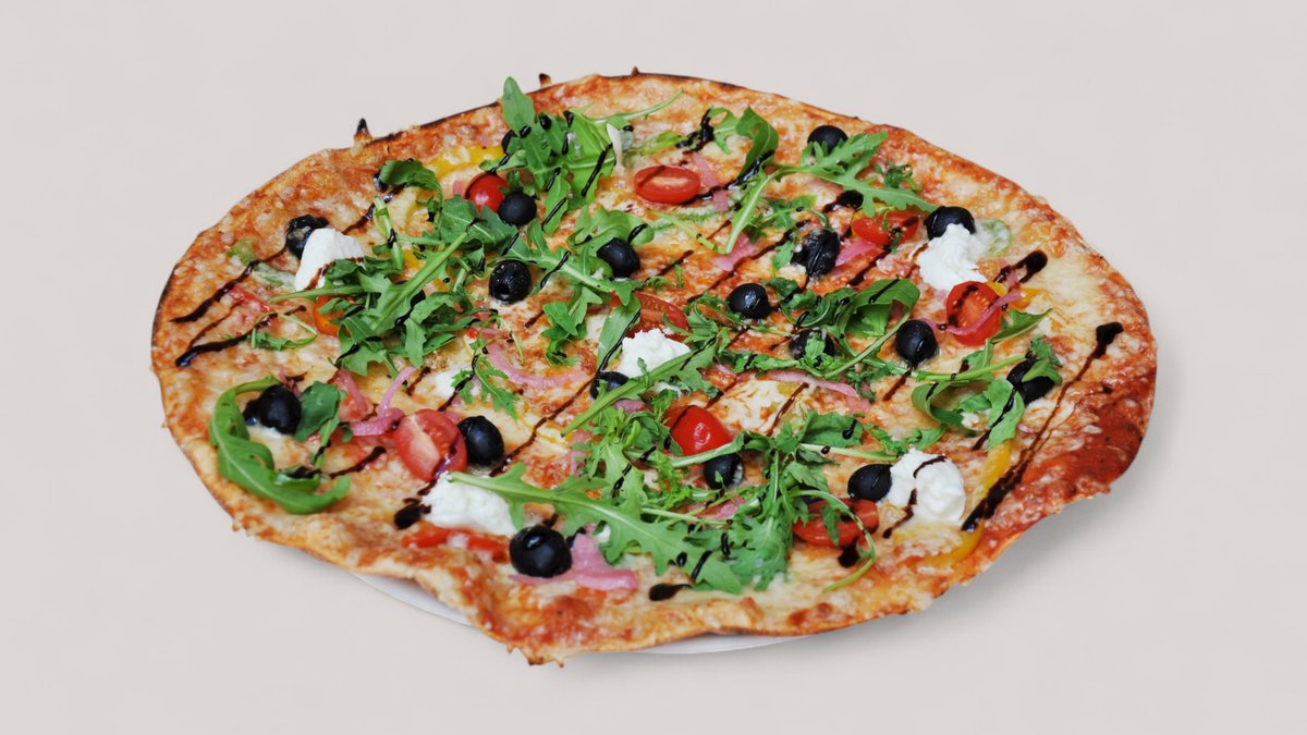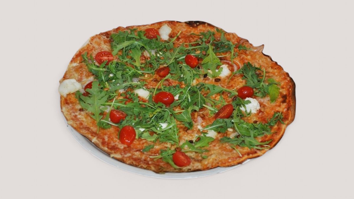 oliivia, paprikaa, marinoitua punasipulia, kirsikkatomaattia, rucolaa, balsamicoa, tuoretta mozzarellaa