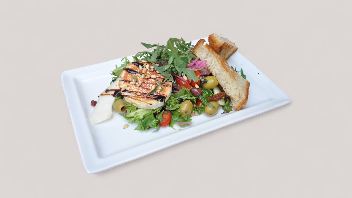 Paahdettua vuohenjuustoa, melonia, aurinkokuivattua tomaattia, oliiveja, marinoitua punasipulia, sitruunainen oliiviöljykastike