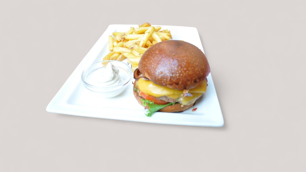 Naudan jauhelipihvi, juustoa, pekonia, talon paahdettua aiolia, tikkuperunat