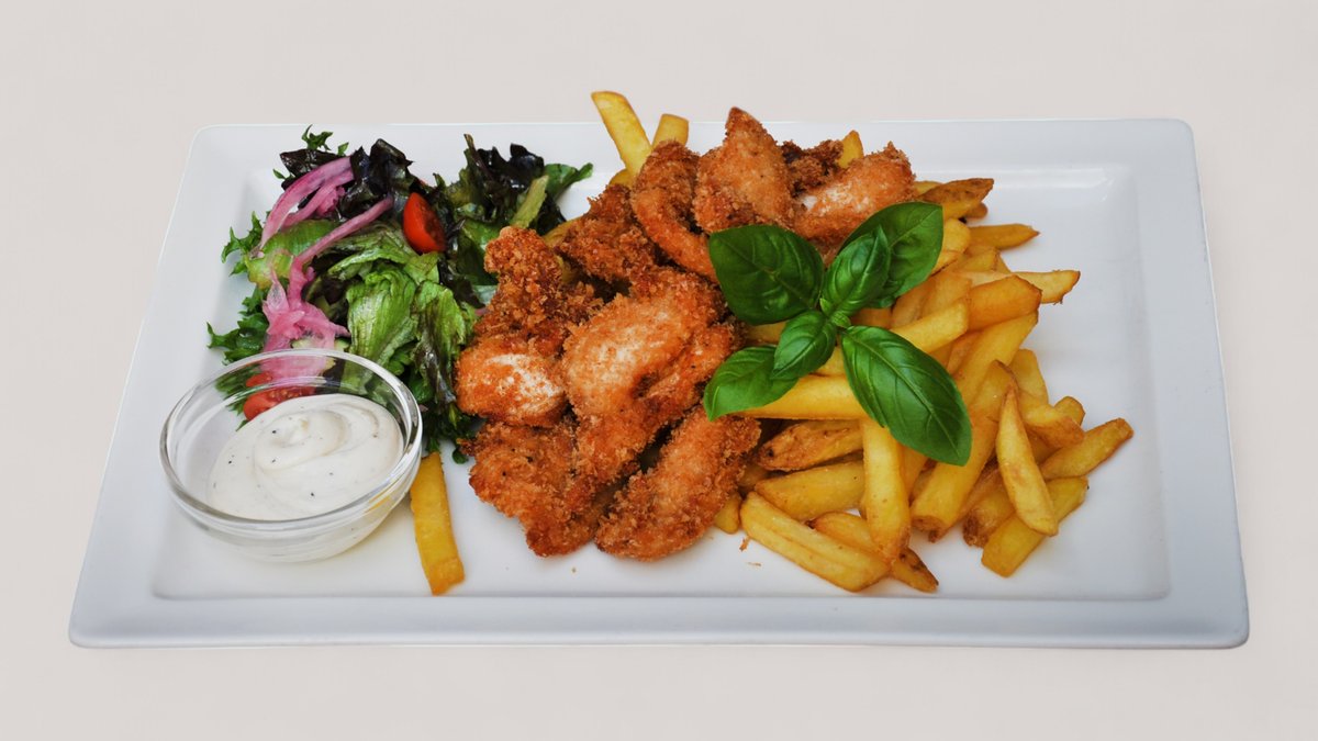 Friteerattua kanaa, tikkuperunat, aiolia tai talon hampurilaismajoneesia