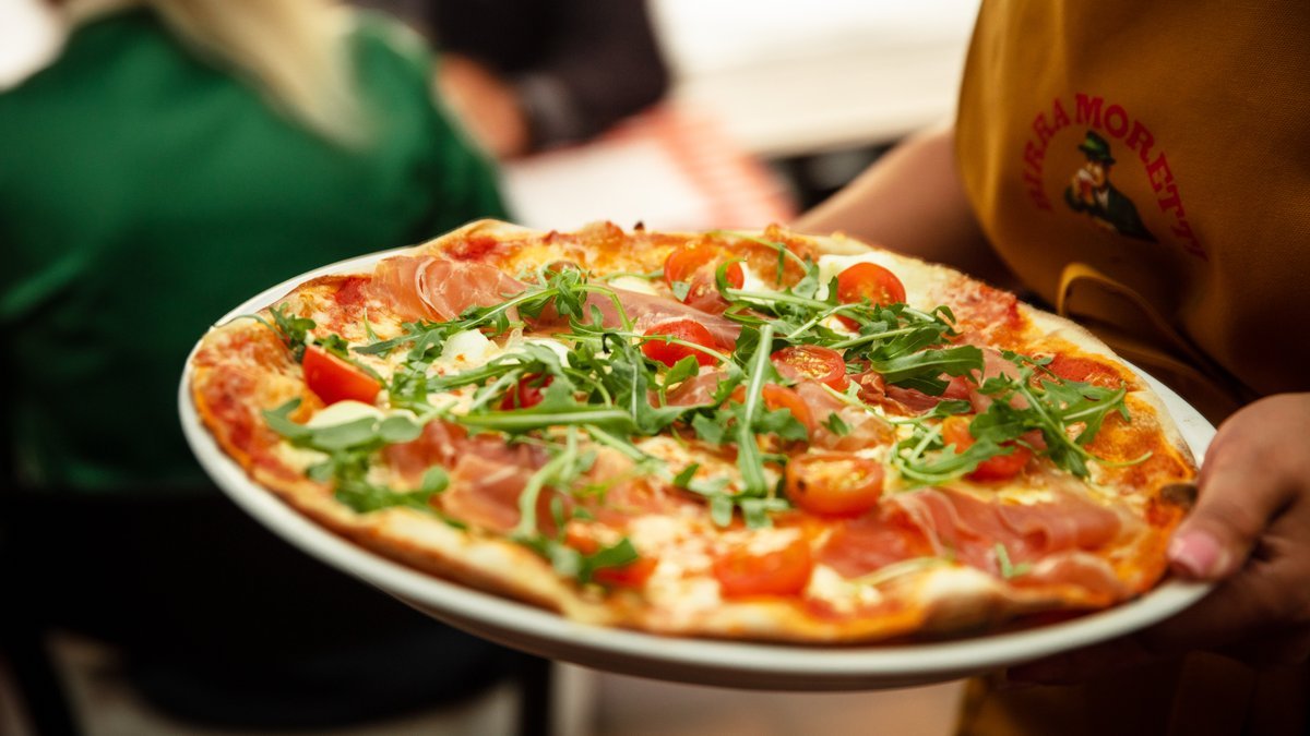tryffelicremeä, herkkusieniä, marinoitua punasipulia, parmankinkkua, rucolaa, parmesanlastuja, mustapippuria