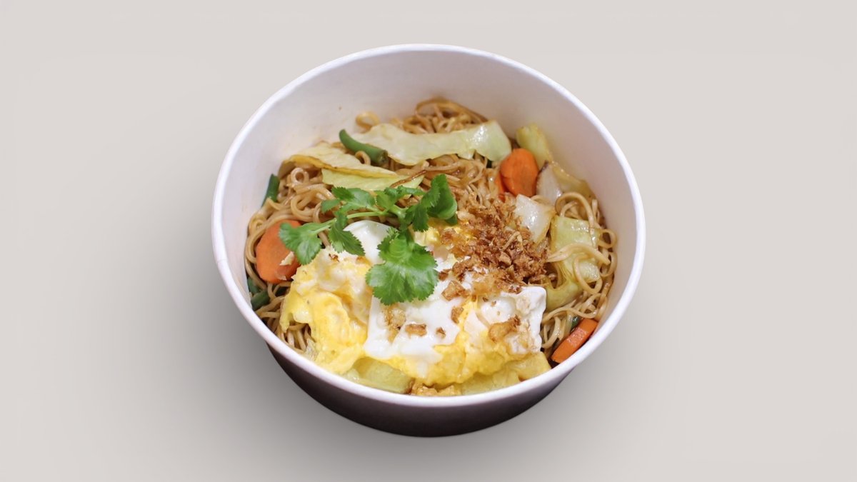 porkkana, kaali, vihreät pavut, shiitakesieni, sipuli, kananmuna, kastike (osterikastike, soijakastike, hoisin-kastike, valkosipuliöljy), chilikastike, korianteri, munanuudelit