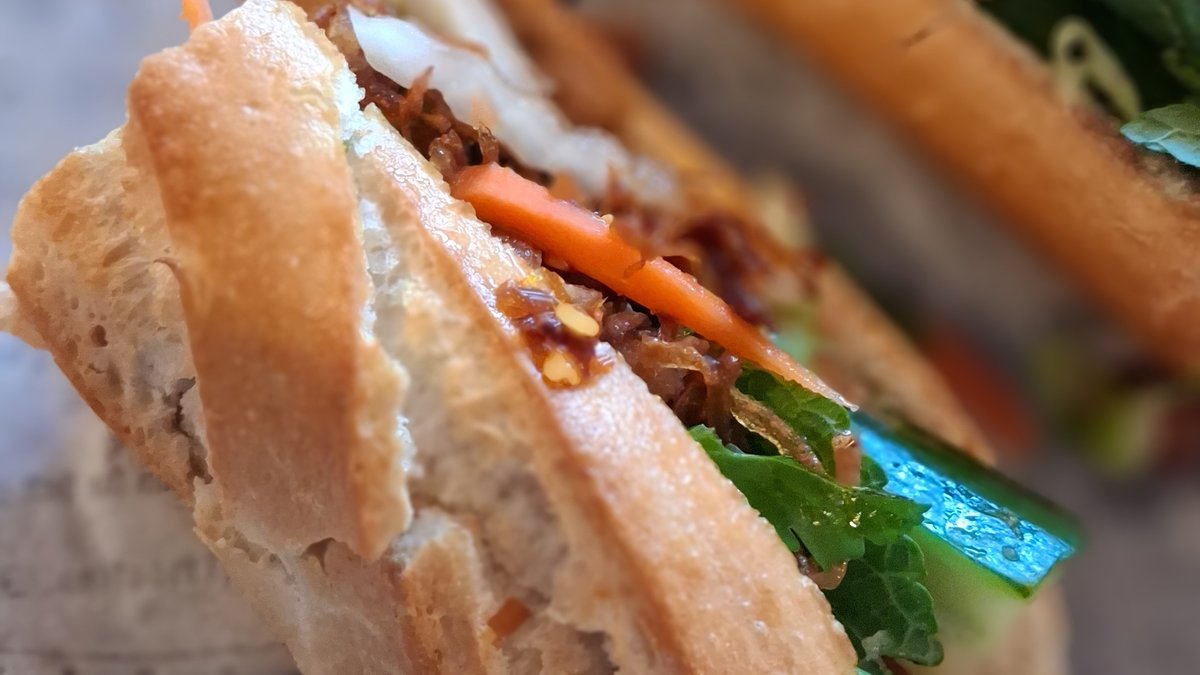 vehnäpatonki, pikkelöityä porkkanaa, kurkkua, korianteria, soijasuikaleita, hoisin-kastiketta ja talon omaa kastiketta.