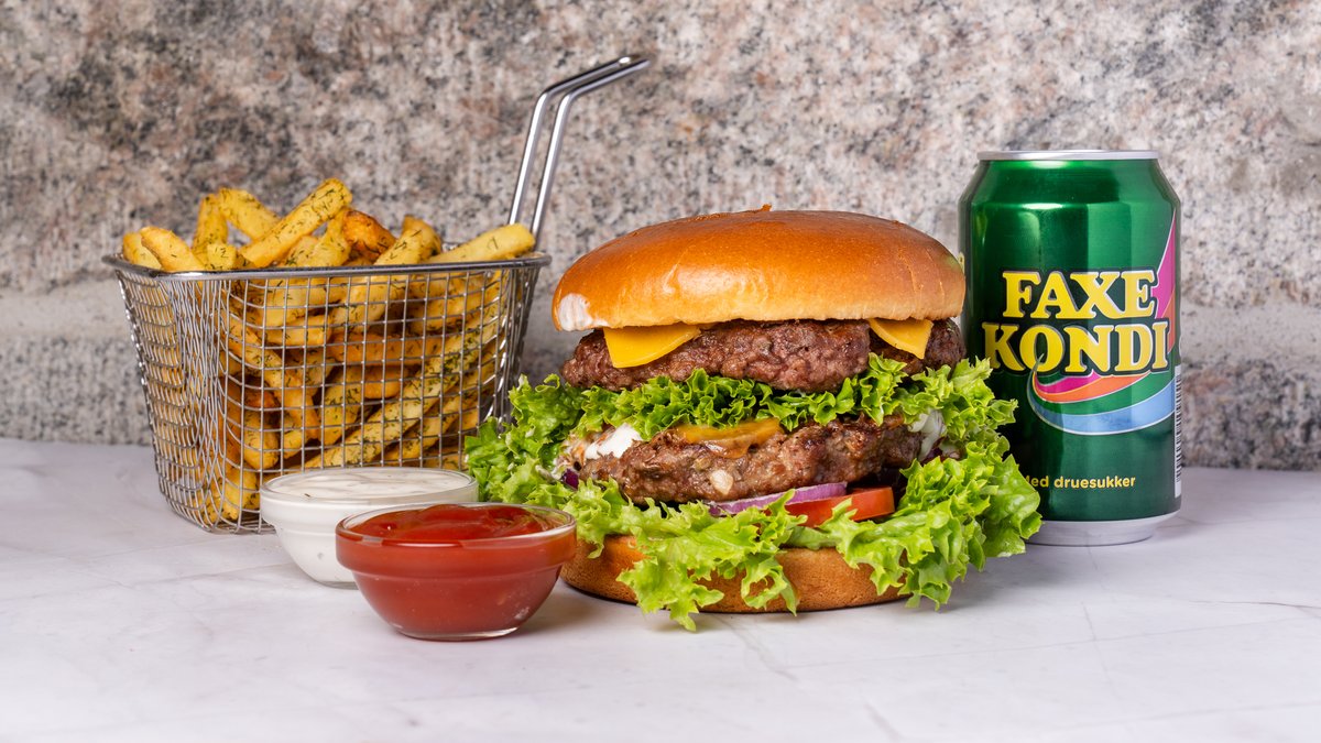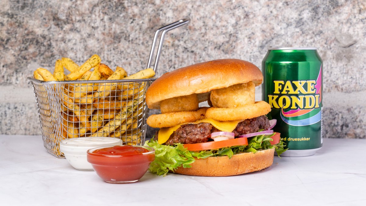 200 gram oksebøf, tomat, ost, mayonnaise, agurk, salat, rødløg og hjemmelavet dressing.