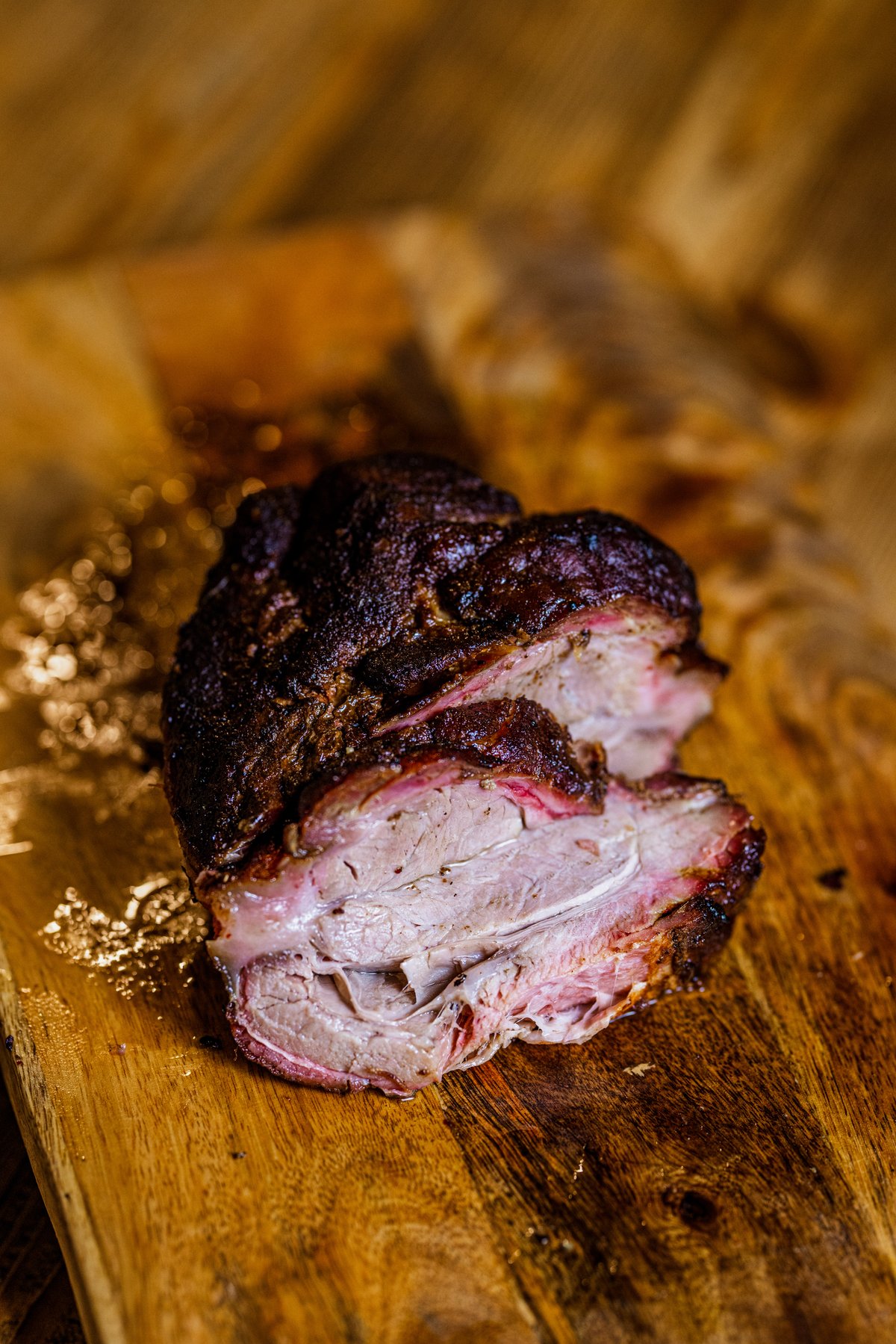 Beef patty, BBQ pulled pork, cheddar, bacon, coleslaw, homemade sauce