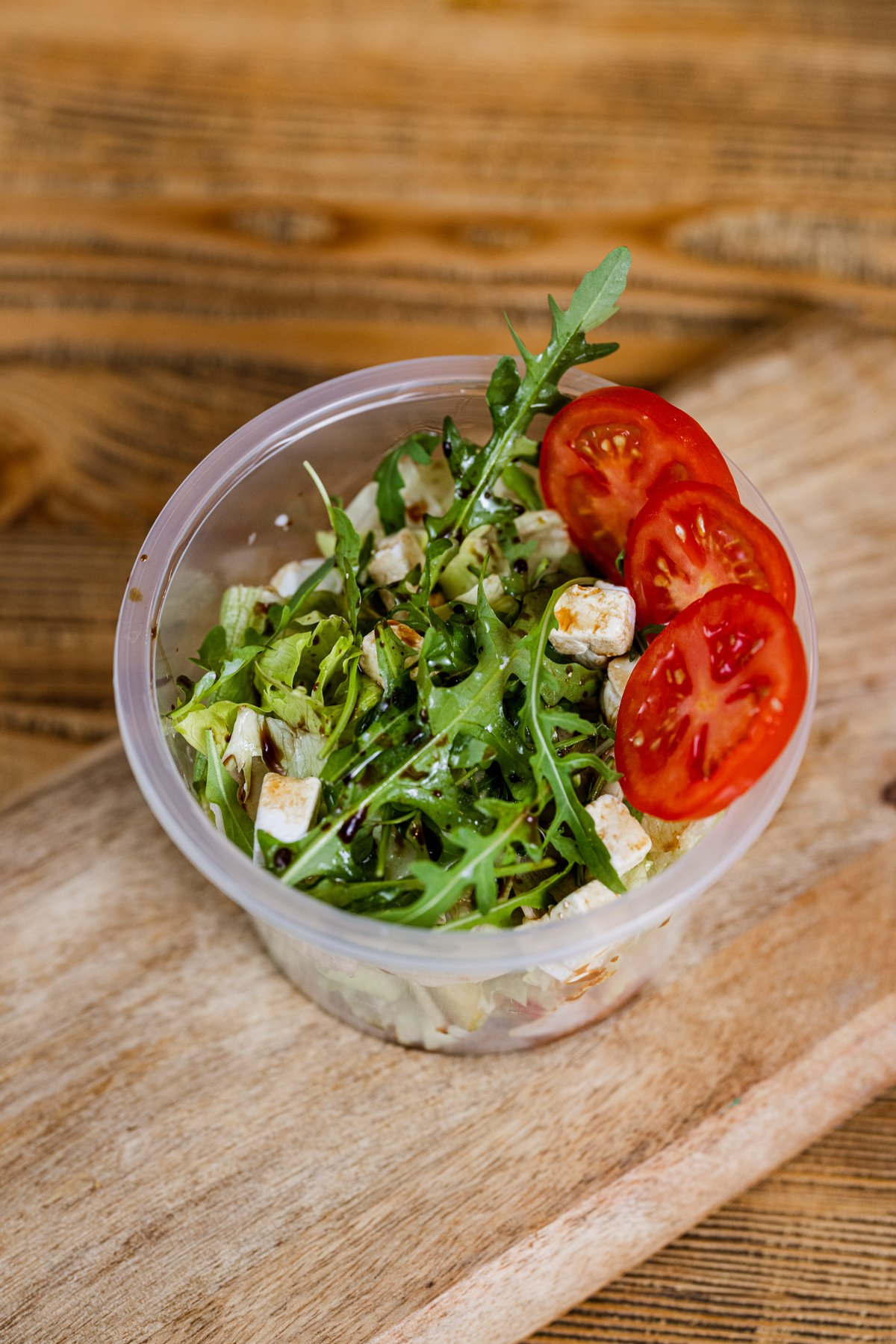 Eisberg salad, mixed vegetables, feta cheese, balsamic vinegar, olive oil, ruccola, 100g BBQ chicken breast