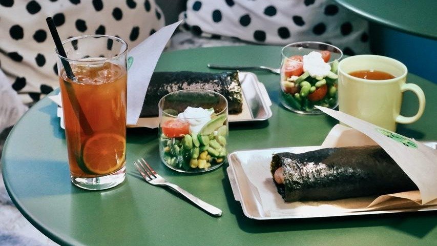Sushi rice, nori, salad, bacon (pan-fry), avocado, scallions, pickled onions, teriyaki sauce, soy sauce