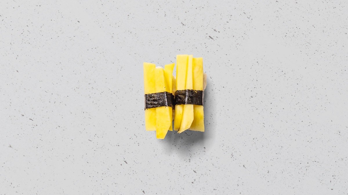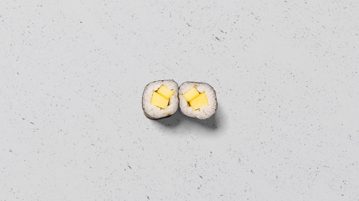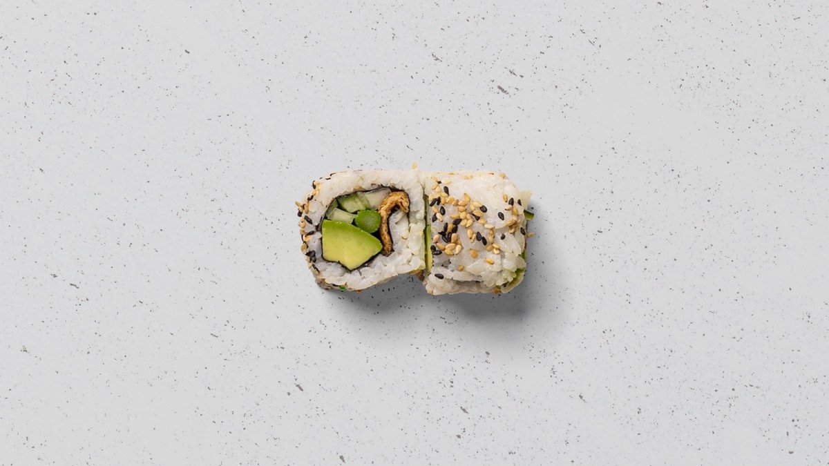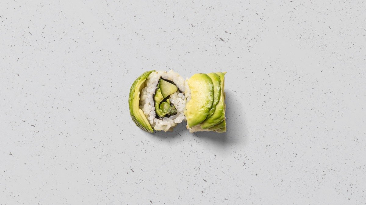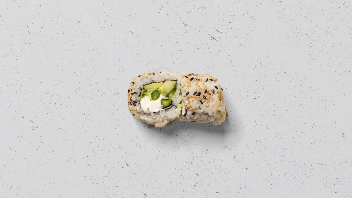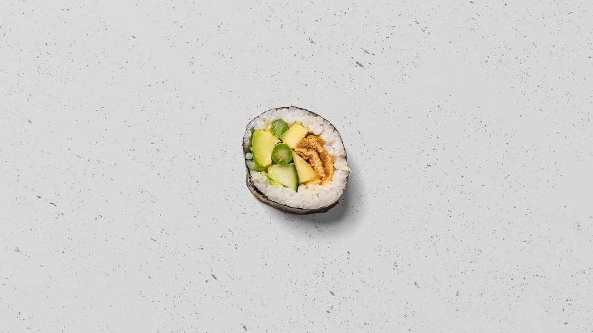 Avocado, agurk, mango, tofu og asparges, rullet i tang.