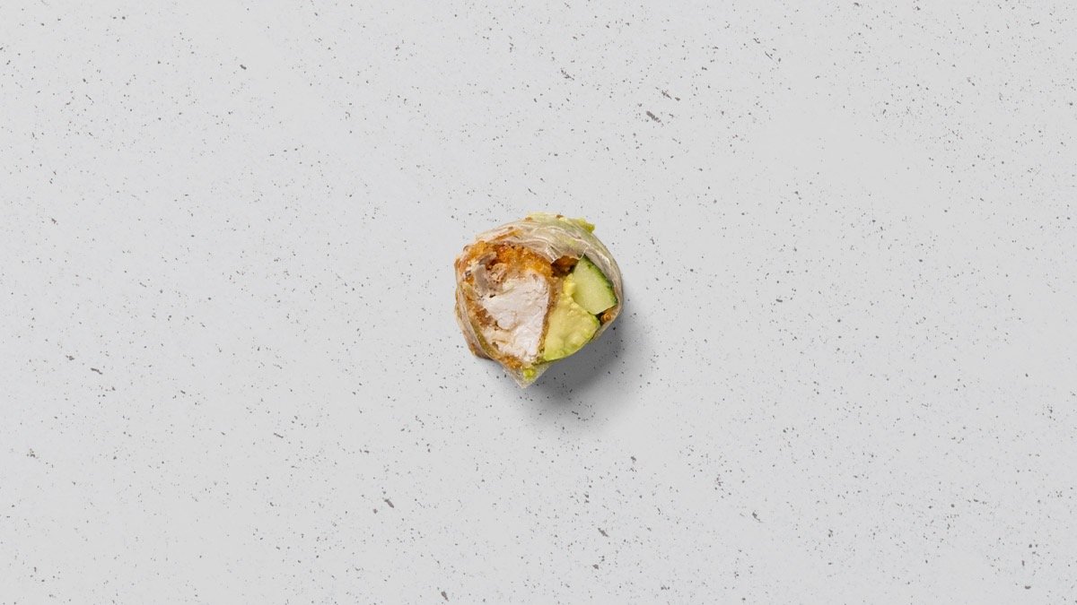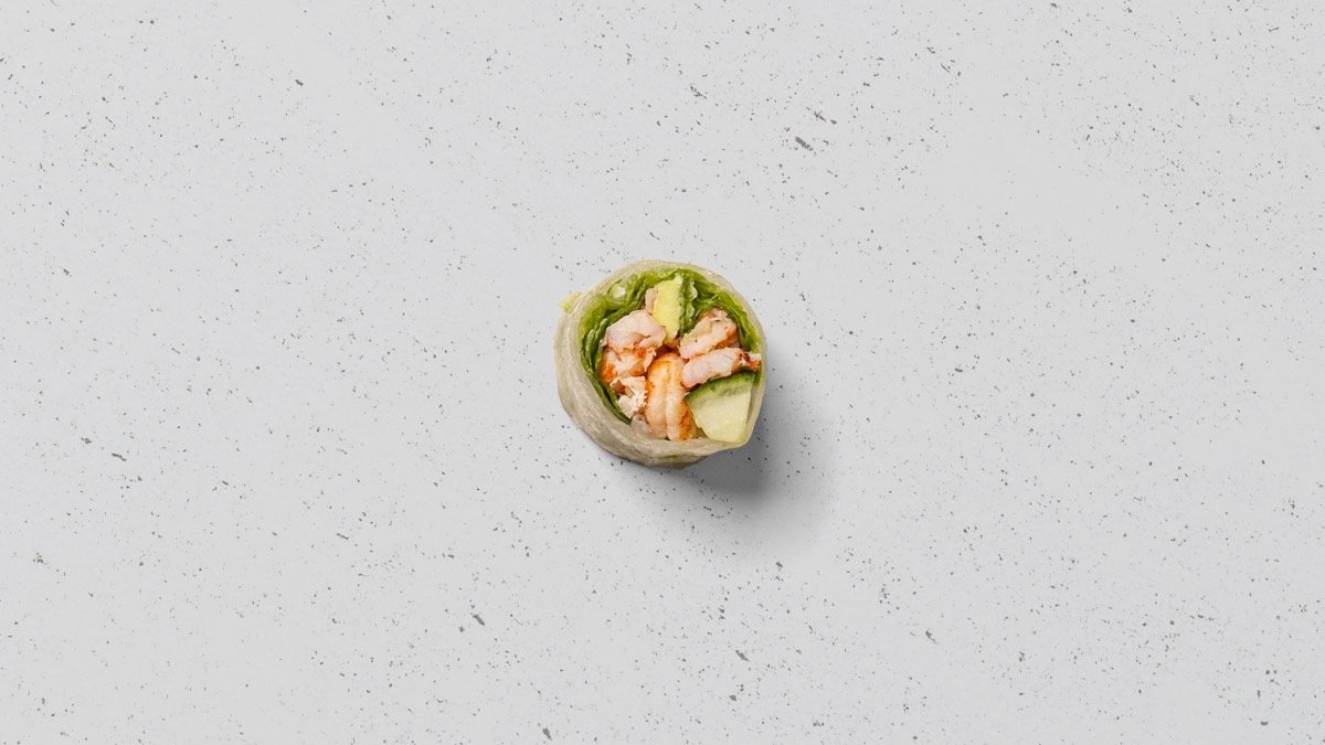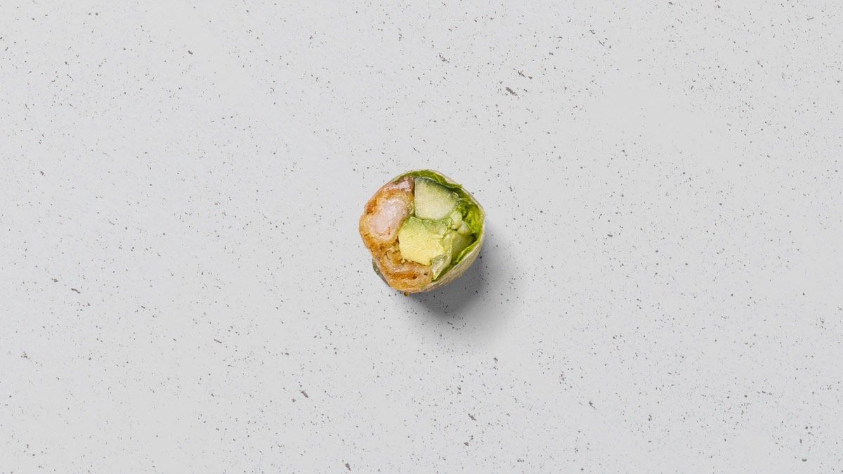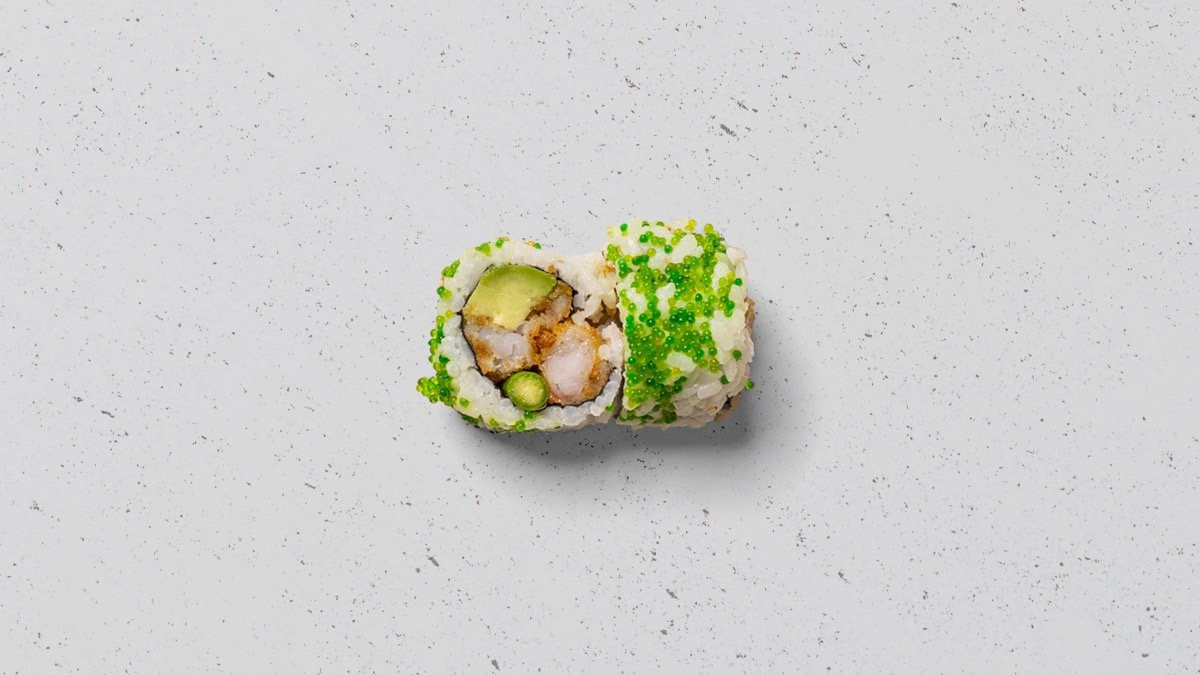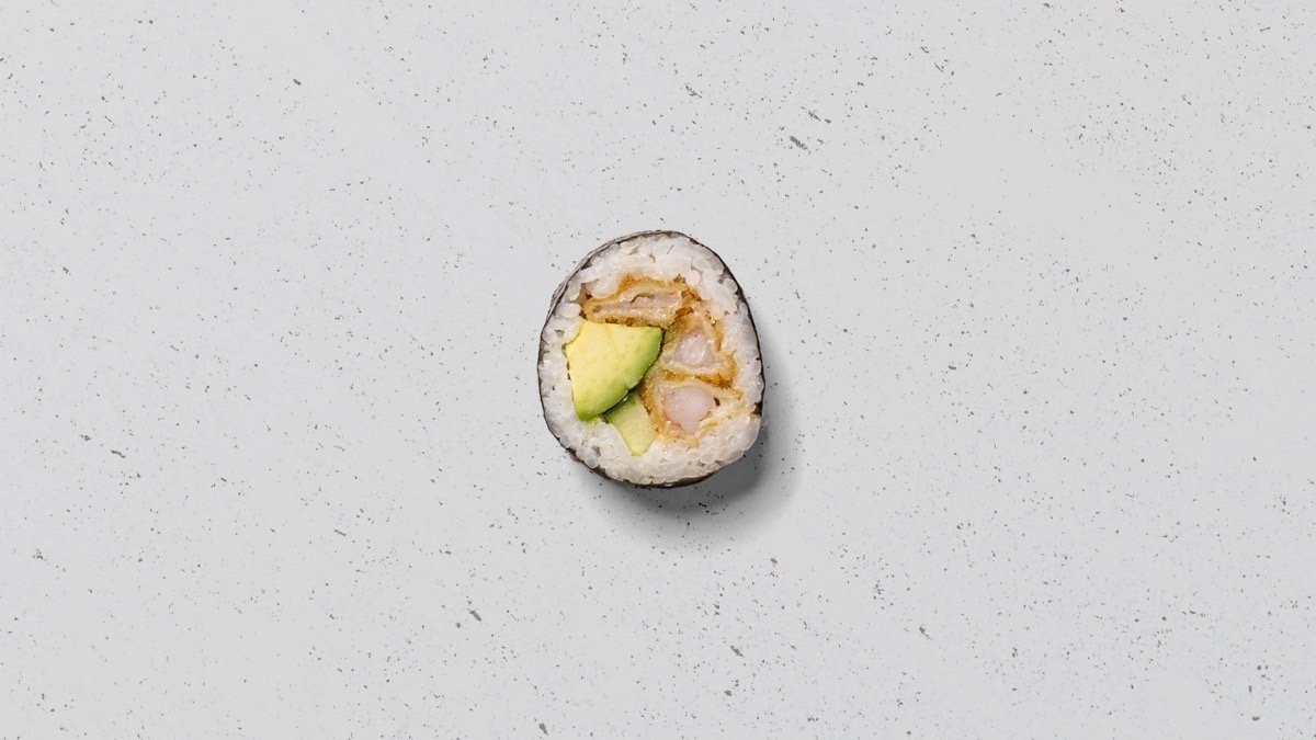Crispy ebi, avocado, agurk og chili mayo, rullet tang.