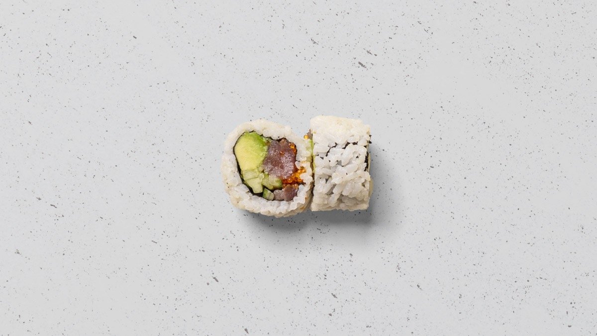 Tun, avocado, agurk, mango, spædesalat, sushi ris og chili mayo.